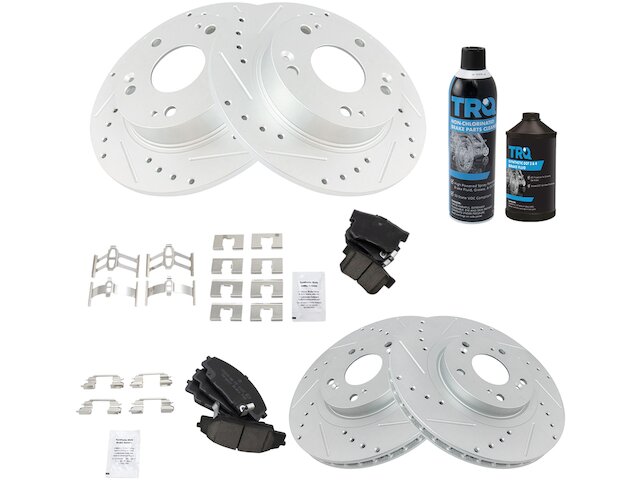 Package Contents: (1) Front Ceramic Brake Pad Set; (1) Rear Ceramic Brake Pad Set; (1) Brake Cleaner & Fluid Kit; (1) Front Premium G-Coated Performance Brake Rotor Set; (1) Rear Premium G-Coated Performance Brake Rotor Set