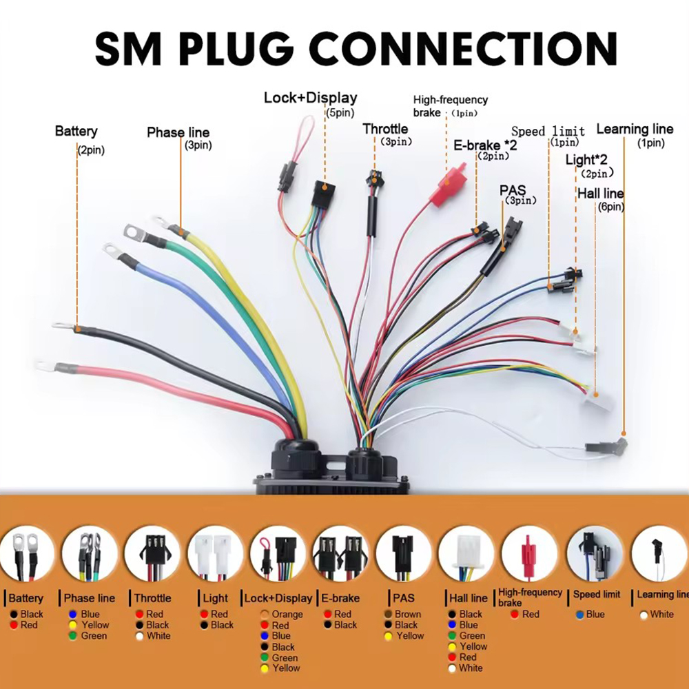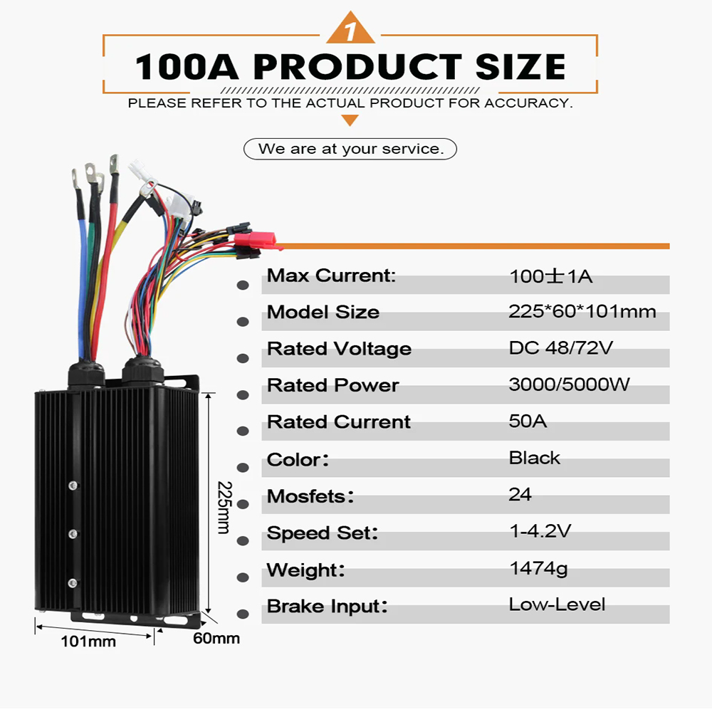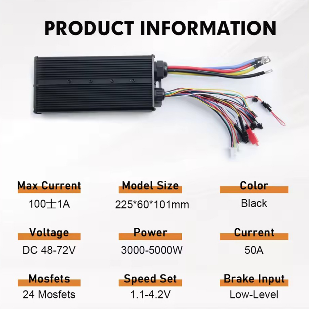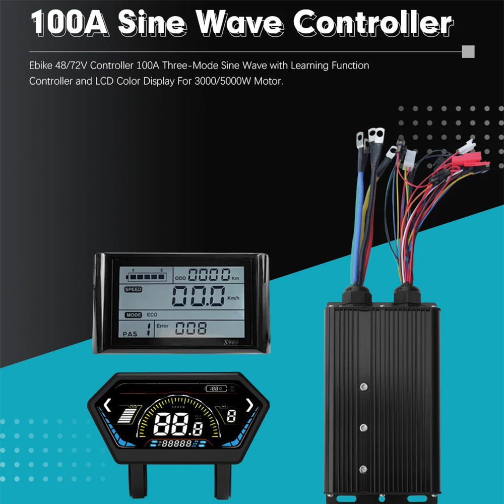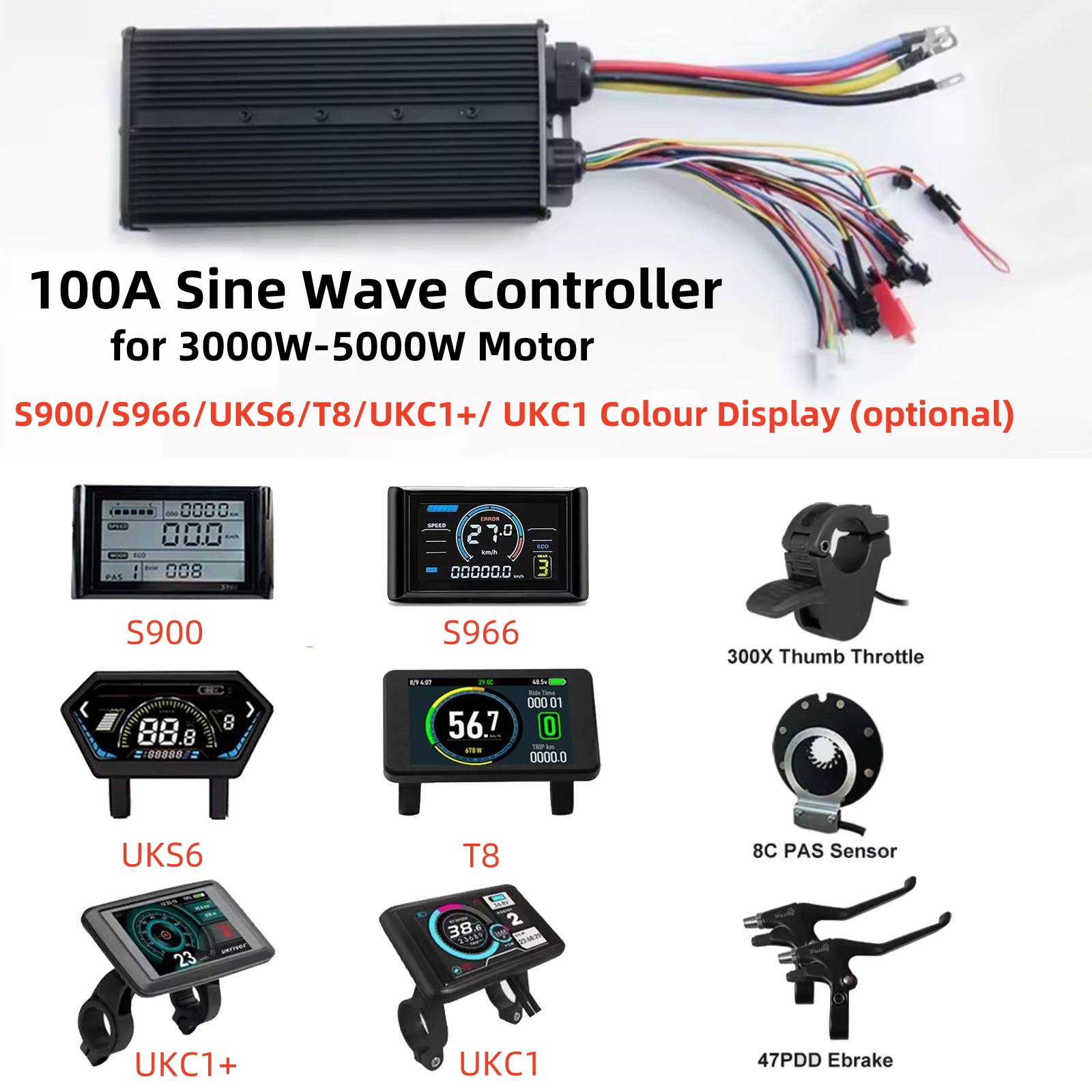 100A Controller : 1.Maximum current:100±1A 2.Size:225*101*60 mm 3.Weight:1474g 4.Mosfets:24 mosfets 5.Cable length:all about 13-18cm 6.Rated voltage:DC48V/72V 7.Speed set:1.1-4.2V 8.Rated current:50A 9.Features: a.The Display is easy to install, with clear screen display and powerful functions b.Brushless Hub Motor for 3000W/5000W, Electric Bike, Electric Bike Kit c.The controller has a headlight function, making it more convenient and safe for you to ride at night LCD Display 1.Type :LCD Color Display 2.Voltage :24V 36V 48V 52V 60V 72V 3.Plug :5Pin Female SM Plug 4.Holder Diameter :φ22mm 5.Cable Length:30cm ( SM ) 6.model:S900/UKC1/S966/UKC1+/UKS6/T8 300X Thumb Throttle: 1.Type: 300X 2.Working voltage (V): 5V 3.Output voltage (V): 0.8-4.2V 4.Turning angle (°): 0-70 5.Application: 24V 36V 48V 72V 6.Type: SM connector 7.Wiring mode: three-core wiring 8.Waterproof: IPX5 9.Material: PC+ABS 10.Color: Black 47PDD Brake Lever 1.Colour: Black 2.Cable length: 180cm/70.9in (normal connector) 3.Weight: 266g (a set) 4.Waterproof:IP76 5.Material: Aluminum Alloy Package includes: 1 * 1 set Sine Wave 3-Mode Controller