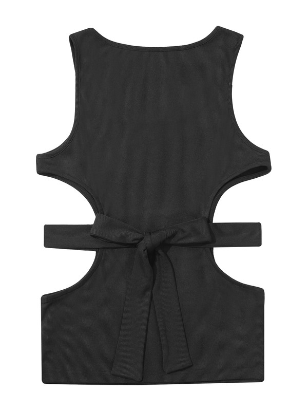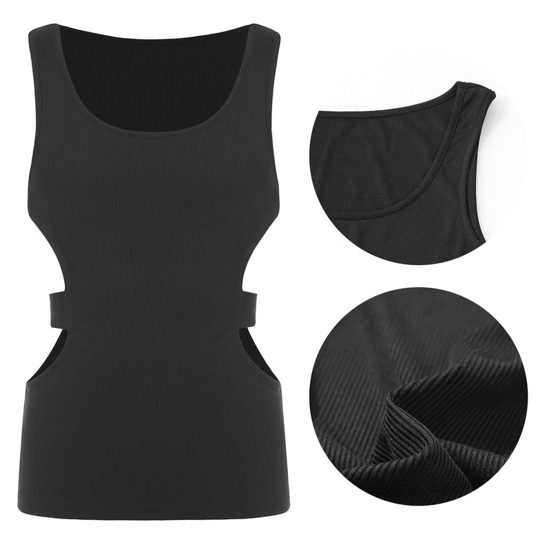 U neckline, ribbed tank top with hollow out design on waist, slim fit, nice stitched.