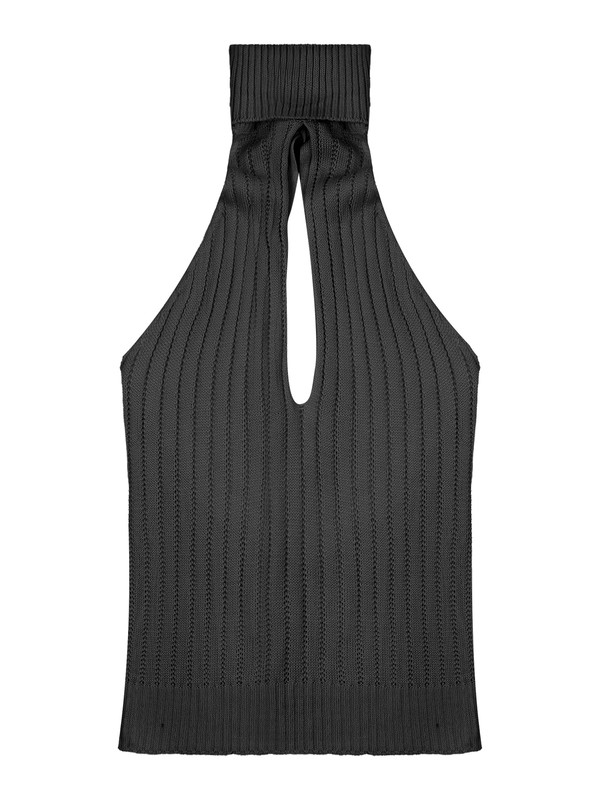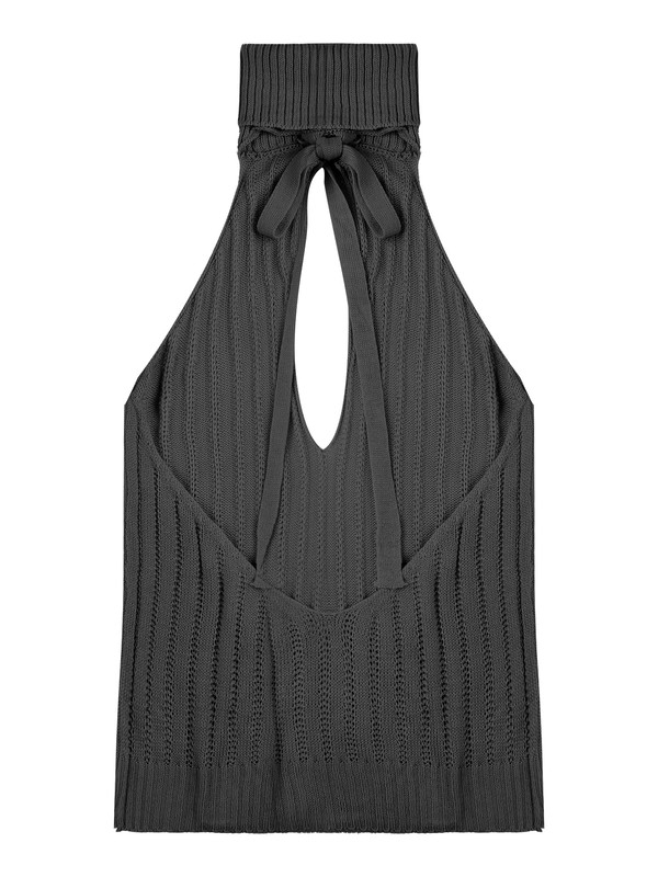 Sleeveless knitted bodycon dress for women, turtleneck, ribbed design, back lace-up detail.
