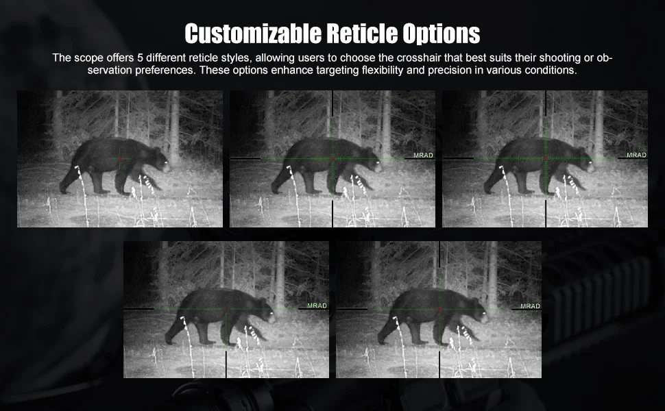 Infrared Illuminator for Total Darkness: The scope comes with an infrared illuminator to enhance visibility in pitch-black conditions. The night mode can be manually activated, and the infrared intensity is adjustable based on distance. As a night vision scope for hunting, it provides precise target detection in low-light environments.