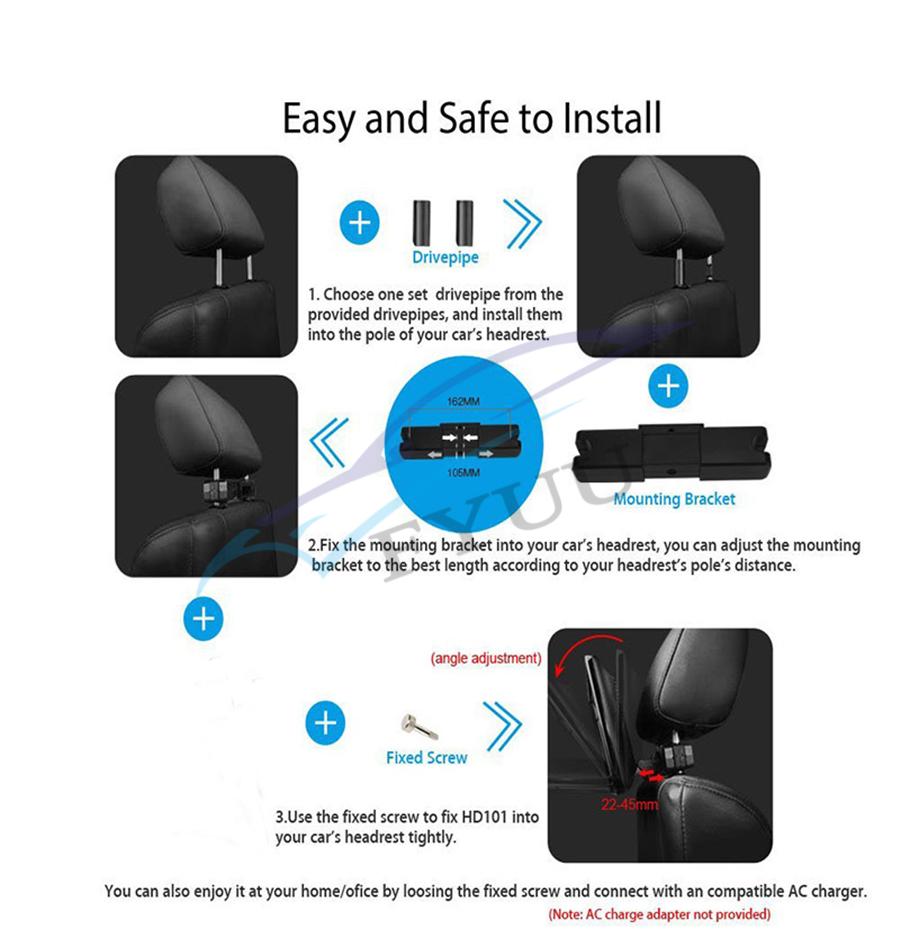 With Sepcial Mounting design, its specially for Car Rear Seat Entertainment, You can adjust the viewing Angel, Up and down, forward and backward. The Most Important is, you dont need complaicated wired connection, you can DIY installation in 5mins without any wiring connection