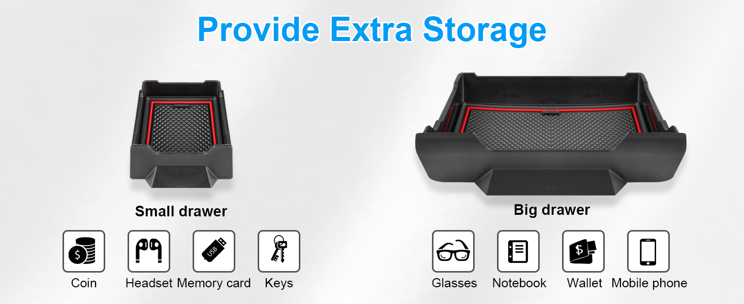 - Function. The center console organizer is an additional storage box that can help you to keep the interior of the vehicle clean and tidy. The storage drawer is great for you to put mobile phone, earphone, keys, cards, USB cable, etc. As well as it makes it easier for you to find what you need and also avoids clutter inside the vehicle.