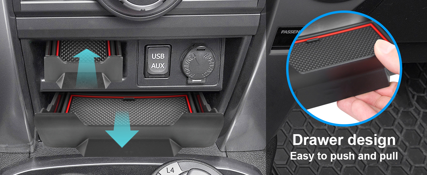 - Design. The storage box is drawer-type which is convenient for you to take out and put in goods. And it has non-slip sponges on both sides, so it is not easy to fall off even on uneven roads. The black color with classic design can blend better with you vehicle, enhancing its appearance and making it stylish and elegant.