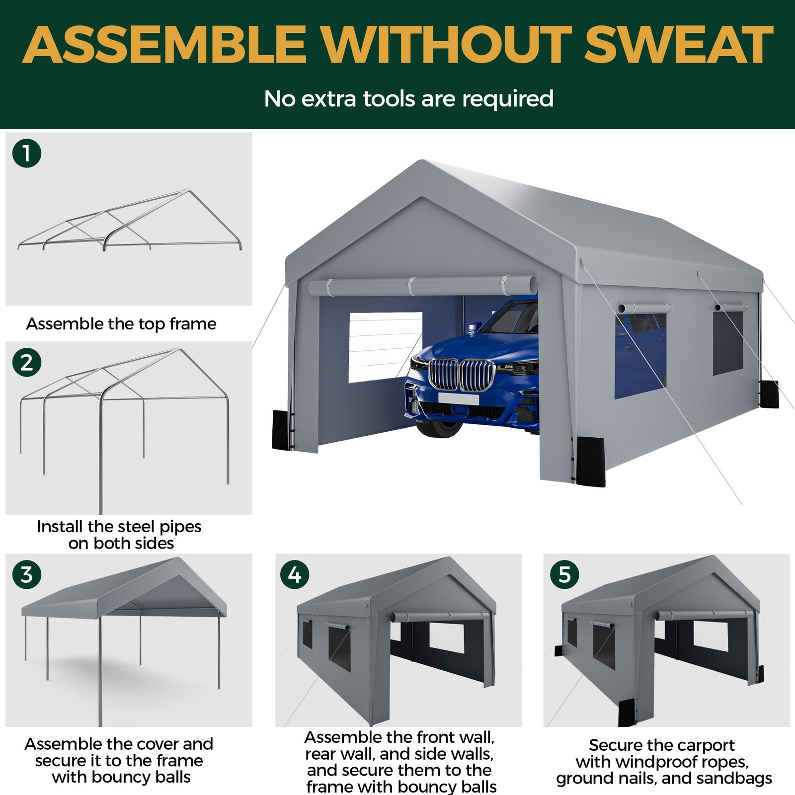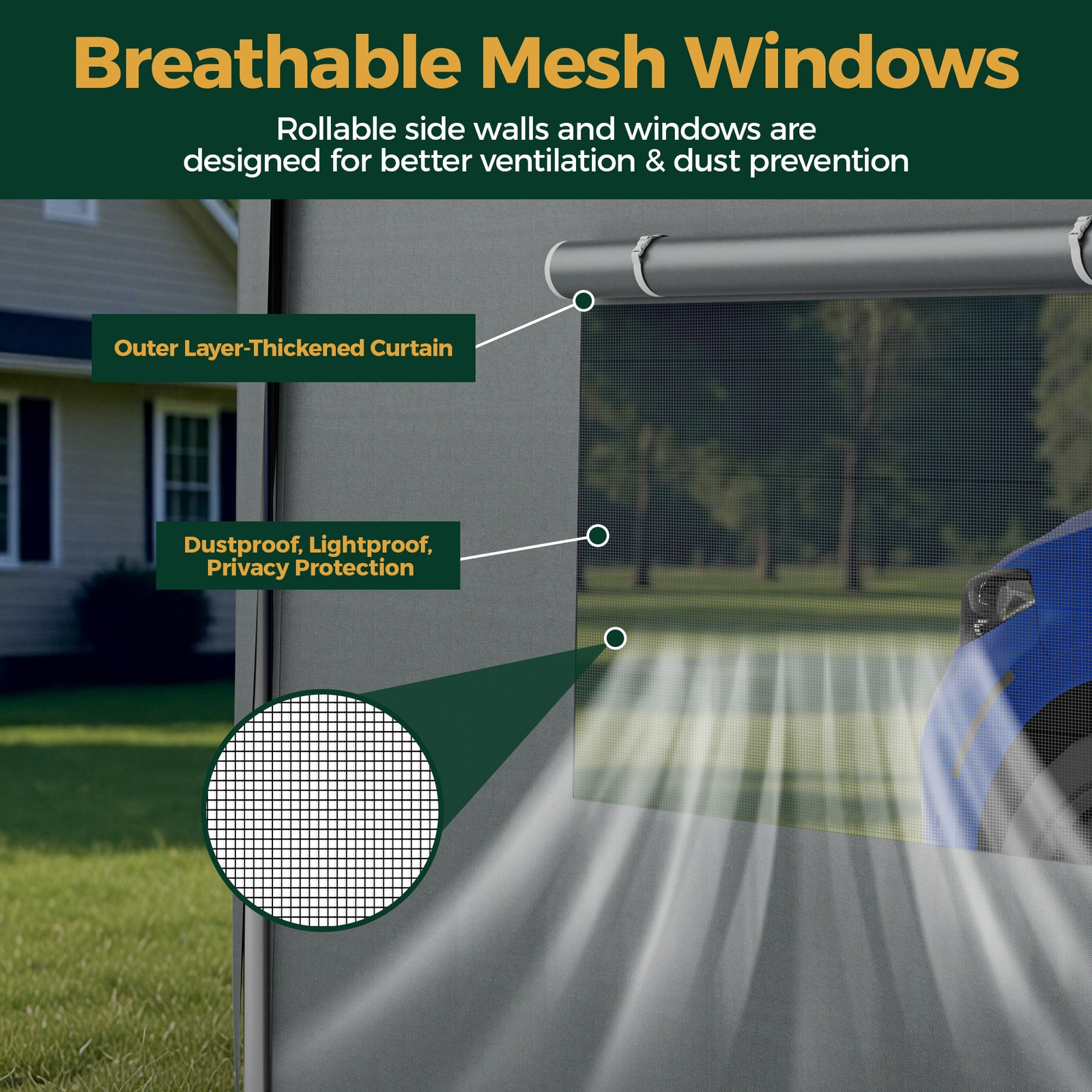 【Removable Sidewall Doors and Windows】The carport shelter has 2 removable sidewalls with Roll-up windows and doors with zippers for ventilation. It can help with airflow and prevent moisture. You can roll the door up or down according to your own needs. Or remove all sidewalls and doors, leaving only the top cover for outdoor activities.