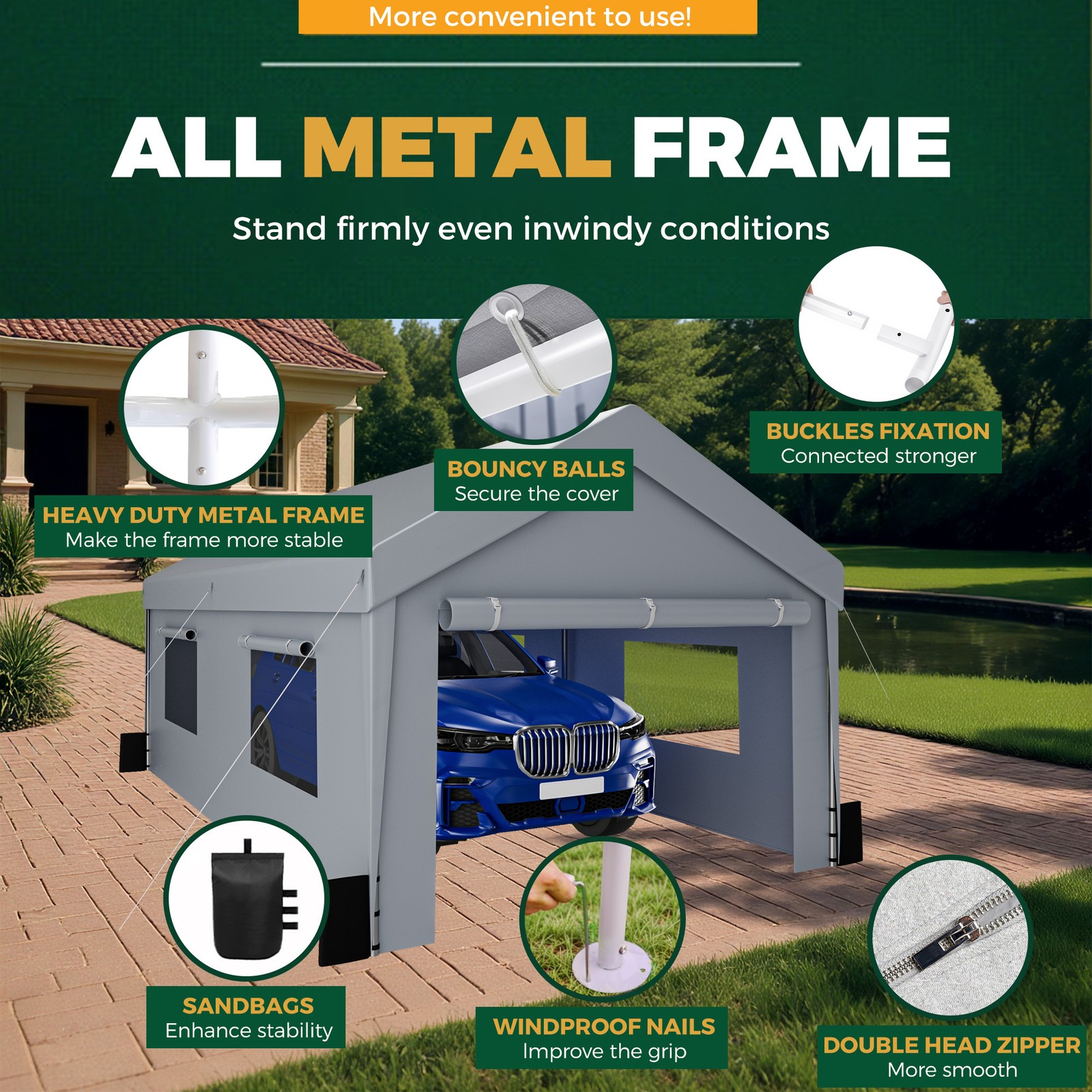 【Stable Structure】The heavy carport is made of powder-coated steel pipes with a diameter of 33mm and a thickness of 0.8mm, ensuring durability, rust resistance, and corrosion protection. Reinforced with ground stakes, wind ropes, and sandbags, it enhances stability and longevity in various conditions.