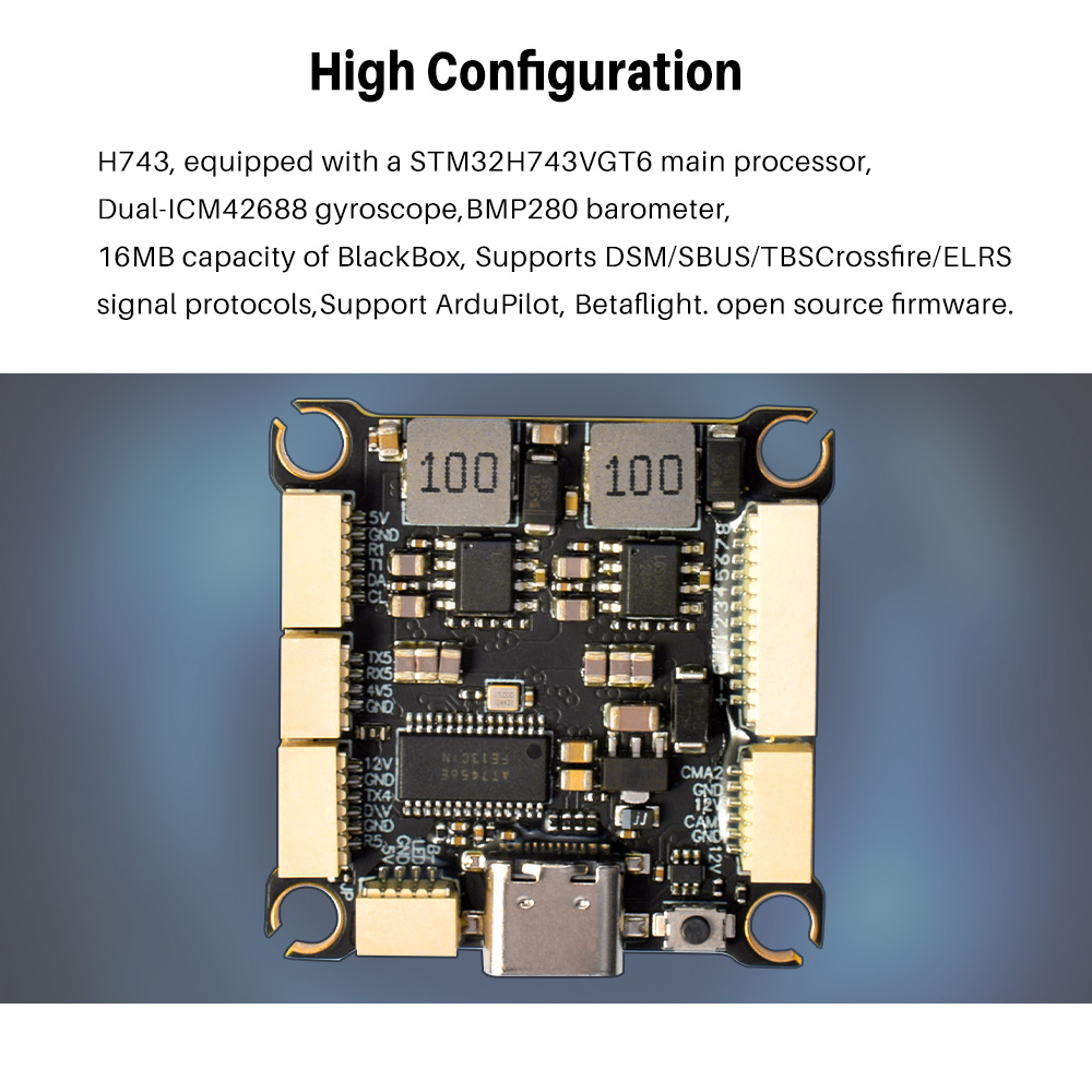 Features: 1. Open-source Betafight Flight Controller. 2. High Configuration: STM32H743VGT6 master, Dual-ICM42688 gyroscope, BMP280 barometer. 3. Supports connectivityto all DJl Air Units. 4. lt offers 7 available UART ports, 12 PWM outputs, I2C and an OSD. 5. Built-in OSD module, one-step parameterization. 6. Standard sockets and pads all lead out, convenient for users with different needs. 7. ESC Equipped with a TVS transient suppression diode onboard, it better absorbs surge voltage, providing enhanced protection for the ESC. 8. ESC adopts MOS with high cost performance, which hasgood current resistance and long durability, good stability. 9. High-performance processor can support Dshot300/600 protocolat, and the accelerator is smooth and powerful. 10. H743 FC Support Beataflight firmware, ESC Support BlueJay,bidirectional DSHOT. 11. Supports multiple signal protocols (DSM/SBUS/TBSCrossfire/ELRS). 12. Support multiple open source firmware (ArduPilot, Betaflight).