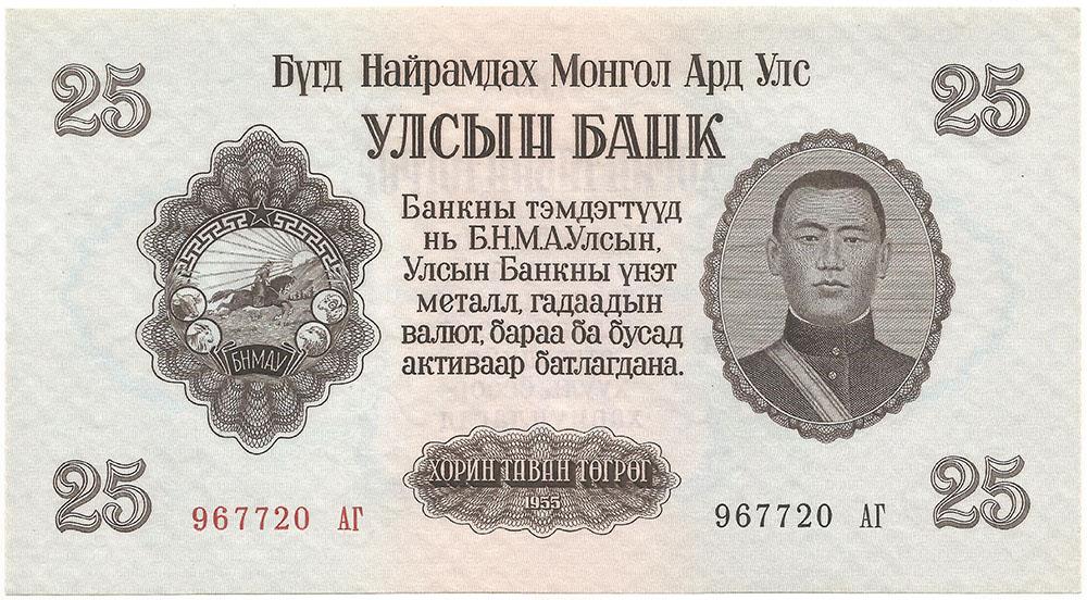 This is a very nice, choice crisp uncirculated, large, “oversize,” 1955, “Twenty-Five Tugrik” note from the least densely populated nation on Earth, “Mongolia”. The nation is located between Russia on the north and China to the south. It covers an area of 603,909 square miles and has a population of just 3.4 million.