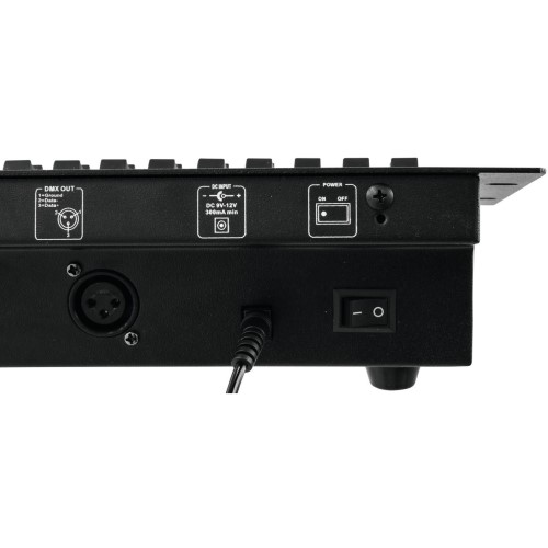 Das Pult verfügt über einen 3-poligen XLR-DMX-Ausgang und unterstützt Firmware-Updates über USB. Die robuste Bauweise mit gummierten Standfüßen ermöglicht den Einsatz als Tischgerät, während der Rackeinbau mit 3 Höheneinheiten eine feste Installation in Racksystemen erlaubt.