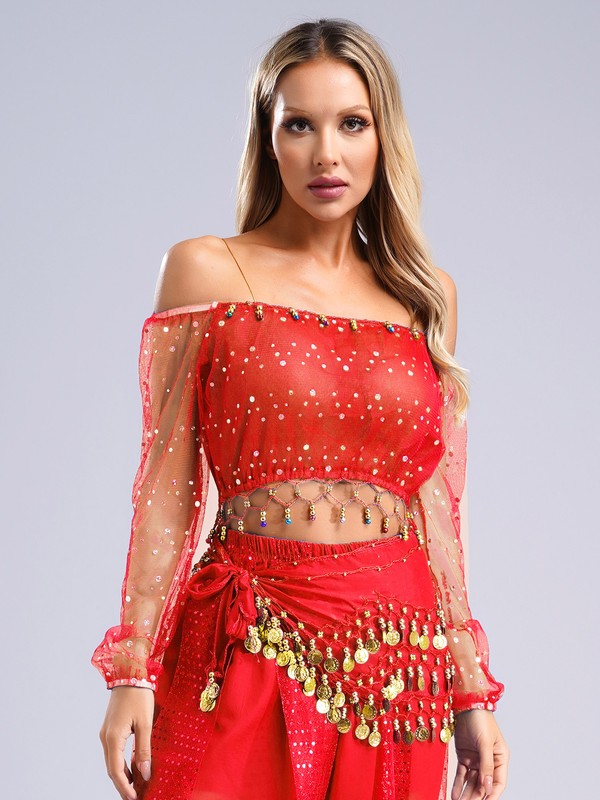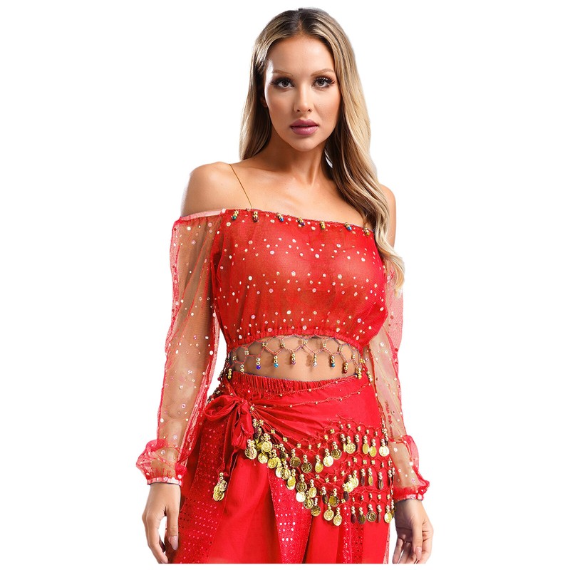 Designed with off shoulder, mesh long sleeve, shiny sequins and bell tassel, crop top makes you very eye-catching and charming.