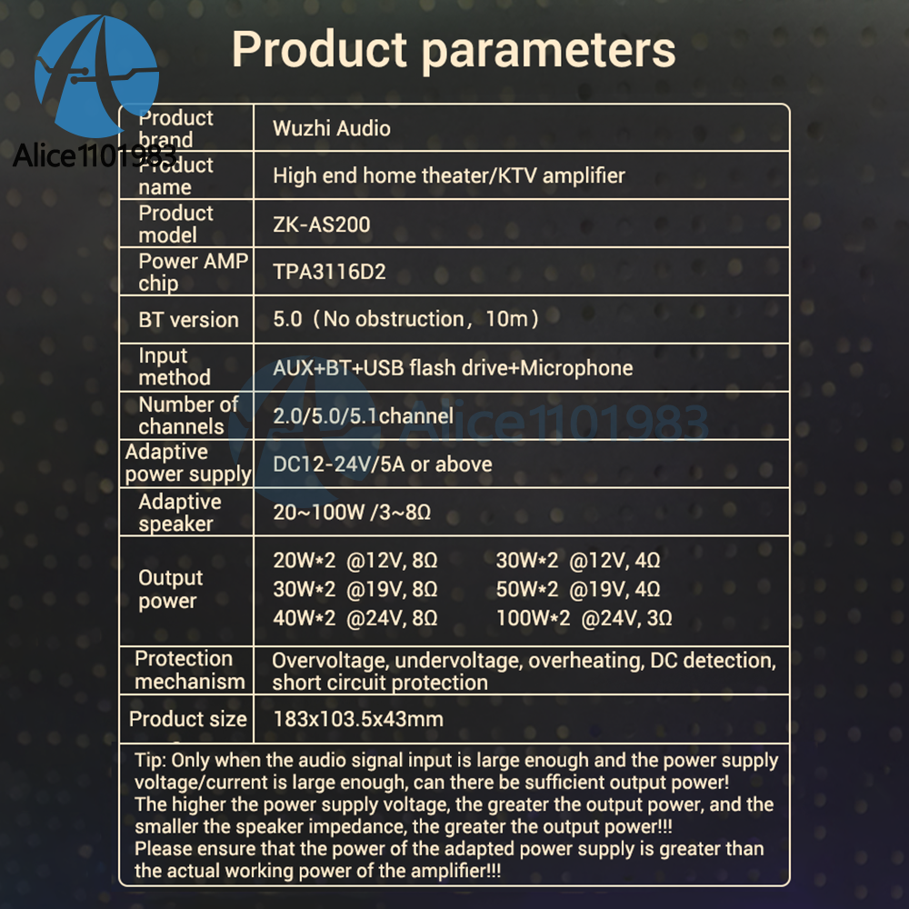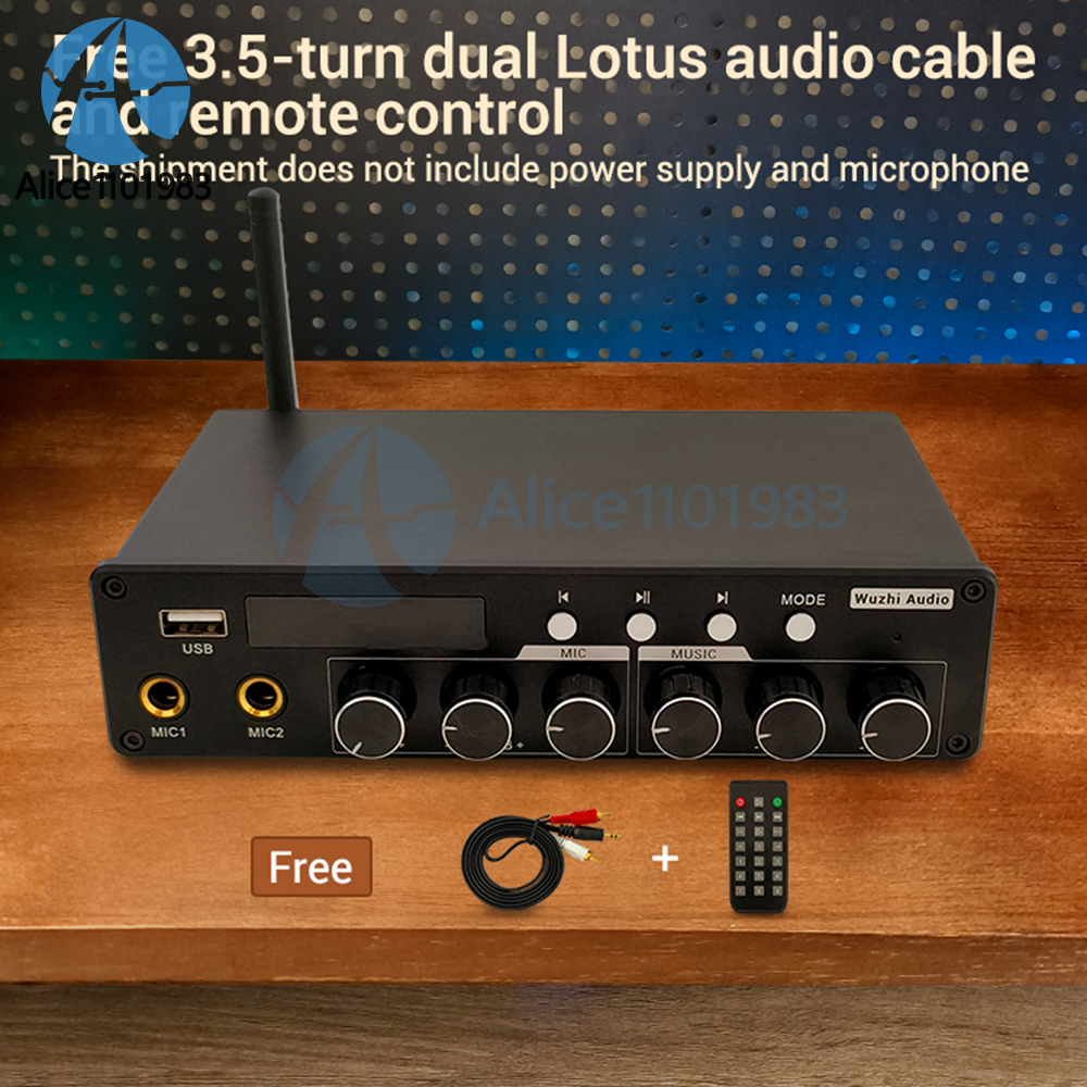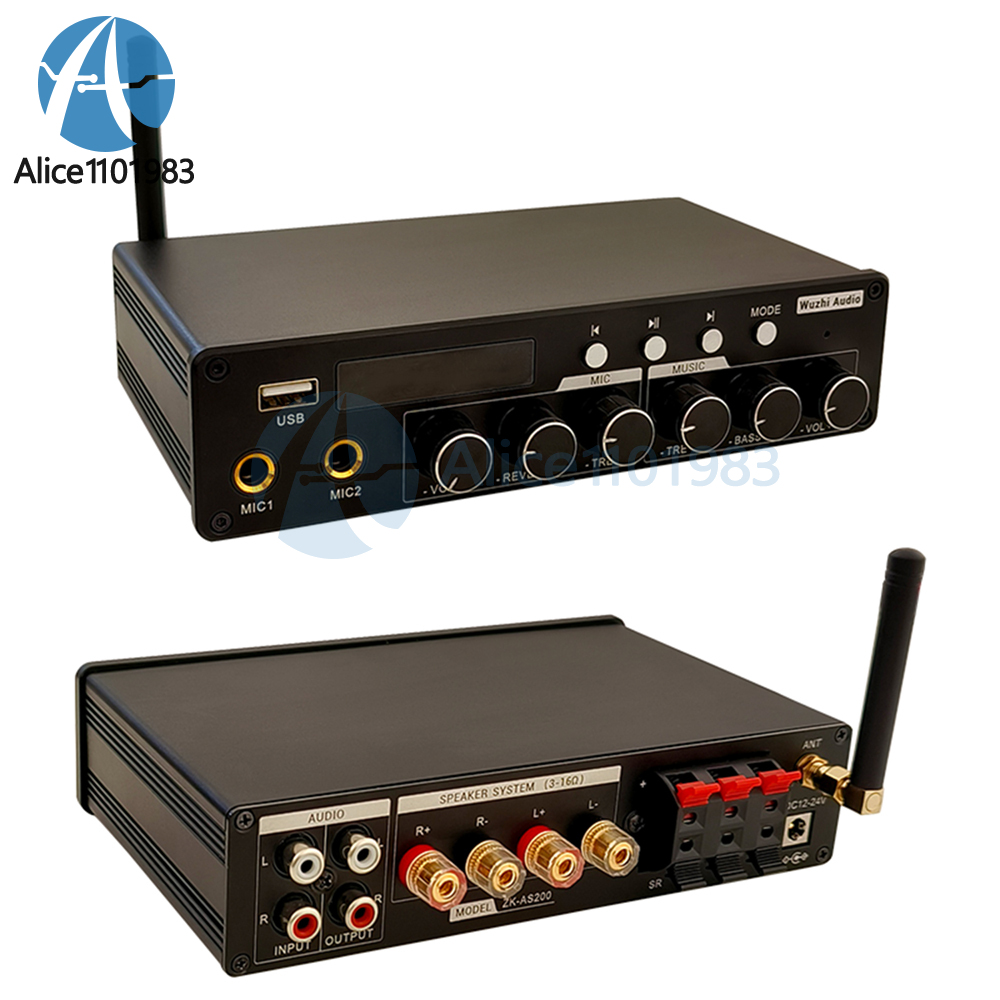 Parameters: Product Name: High end Home Cinema/KTV Amplifier Product model: ZK-A1200 Amplifier chip: TPA3116D2 Bluetooth version: 5.0 (unobstructed, 10 meters) Input method: AUX+Bluetooth+USB flash drive+microphone Number of channels: 2.0/5.0/5.1 channels Suitable power supply: DC12-24V/5A or above Compatible speaker: 20-100W/3-8 Ω Output power: 20W*2@12V,8Ω 30W*2@12V,4Ω 30W*2@19V,8Ω 40W*2@24V,8Ω 50W*2@19V,4Ω 100W*2@24V,3Ω Protection mechanism: overvoltage, undervoltage, overheating, DC detection, short circuit protection Product size: 183x103.5x43mm
