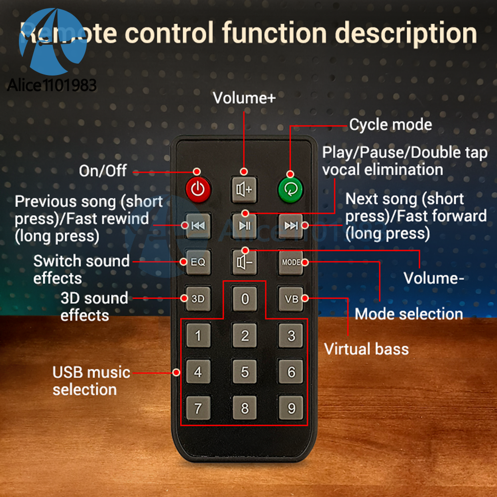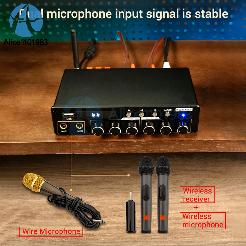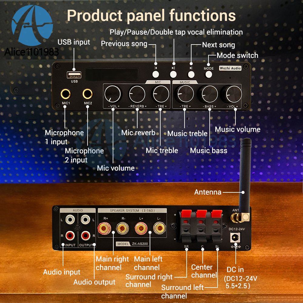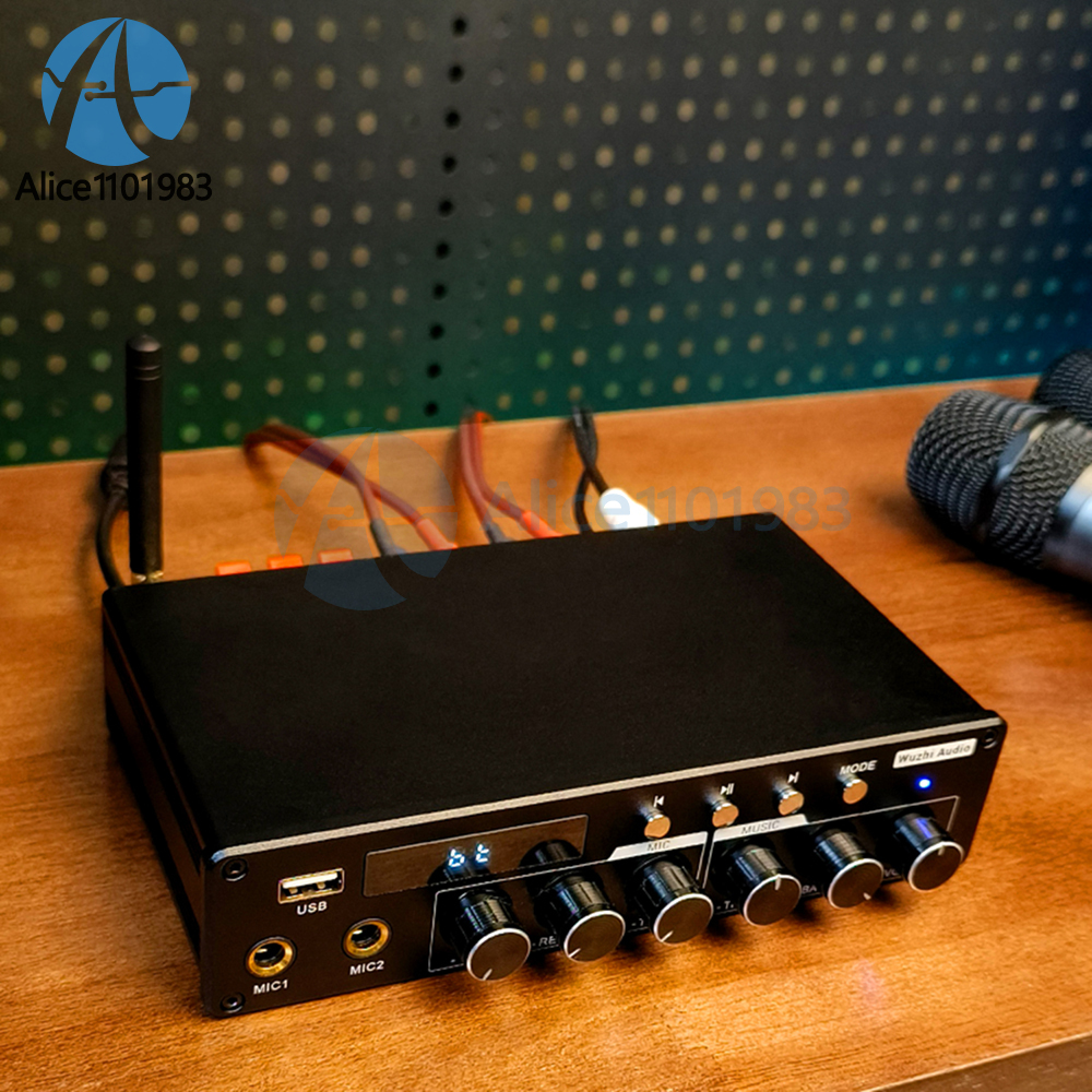 Parameters: Product Name: High end Home Cinema/KTV Amplifier Product model: ZK-A1200 Amplifier chip: TPA3116D2 Bluetooth version: 5.0 (unobstructed, 10 meters) Input method: AUX+Bluetooth+USB flash drive+microphone Number of channels: 2.0/5.0/5.1 channels Suitable power supply: DC12-24V/5A or above Compatible speaker: 20-100W/3-8 Ω Output power: 20W*2@12V,8Ω 30W*2@12V,4Ω 30W*2@19V,8Ω 40W*2@24V,8Ω 50W*2@19V,4Ω 100W*2@24V,3Ω Protection mechanism: overvoltage, undervoltage, overheating, DC detection, short circuit protection Product size: 183x103.5x43mm