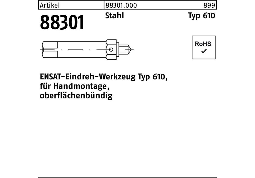 Artikel 88301 Stahl Typ 610 ENSAT-Eindreh-Werkzeug Typ 610 · für Handmontage · oberflächenbündig - Abmessung: M 3 VE=S (1 Stück )Weitere technische Eigenschaften: