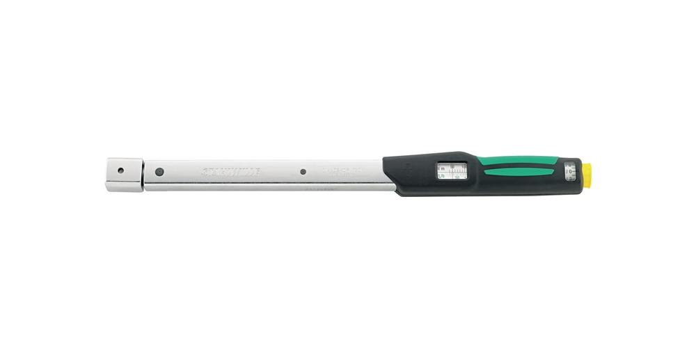 mit Aufnahme für Einsteckwerkzeuge · für den kontrollierten Rechts- und Linksanzug · auslösend · für Arbeiten in der Serienproduktion · Stellknopf kann nach Einstellung des Auslösemoments herausgeschraubt werden · ein unabsichtliches Verändern des Solldrehmoments wird so verhindert · die mitgelieferte Sicherungsschraube schützt darüber hinaus vor Manipulation, ebenso wie die beiliegenden Klebesiegel · keine Verstellung ohne Siegelbruch möglich · QuickRelease-Sicherheitsverriegelung · schnelle, präzise Einstellung durch QuickSelect-Schnellverstellung · Doppel-Stopp-Signal · sehr gut ablesbare Doppelskala mit farblicher Unterscheidung von N.m/ft, lb bzw. ft, lb/in, lb · Linksanzug durch Umdrehen der Steckwerkzeuge · 2-Komponentengriff (resistent gegen Öle, Fette, Kraftstoffe, Bremsflüssigkeiten und Skydrol) · Genauigkeit ± 3 % Toleranz vom eingestellten Wert · Besonderheit:Kein Rücksetzen auf "0" erforderlich, da Messelement nur beim Anziehvorgang belastet wird. Weiterbelastung nach dem Auslösen oder Belastungen entgegen der Funktionsrichtung, z. B. bei festsitzenden Schrauben, wirken nicht auf den Auslösemechanismus, der dadurch vor Beschädigung geschützt wird