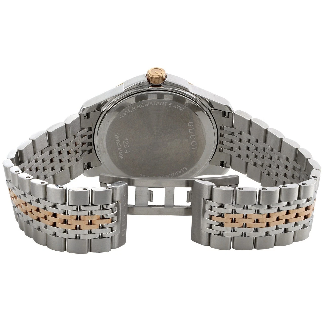 Protected by scratch resistant sapphire crystal, the black diamond patterned dial is completed with rose gold baton hour markers, iconic branding and a date window at 4 o'clock. Swiss Made quartz movement, this Gucci G-Timeless watch will ensure you're telling the time in beautiful style.