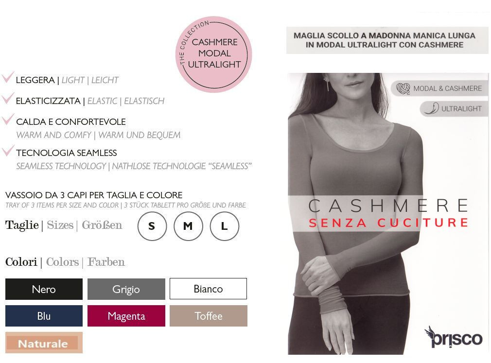 Composizione: 70% MODAL 9% CASHMERE 17% POLIAMMIDE 4% ELASTAN