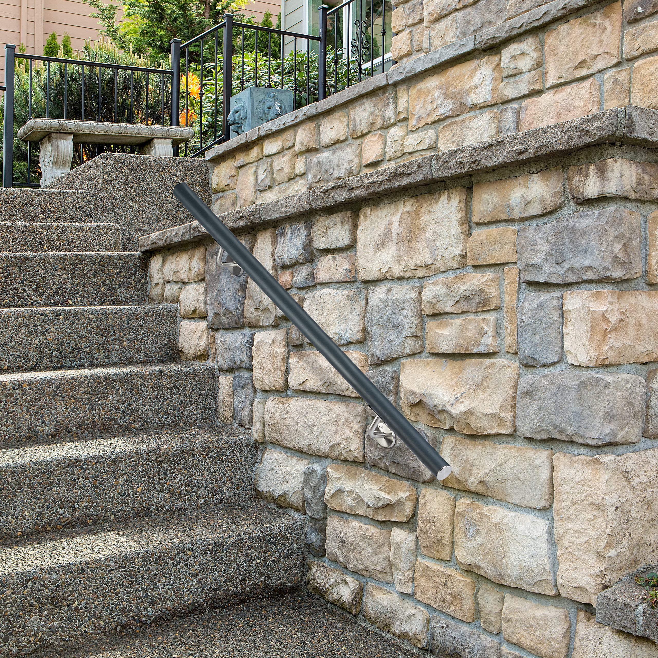 Der Rundhandlauf ist eine tolle Stützhilfe bei Treppen, um Stufe für Stufe sicher nach oben oder unten zu gelangen. Besonders für Kinder, Ältere oder Menschen mit Schwierigkeiten beim Treppensteigen ist das Metallgeländer eine unverzichtbare Hilfe. Im Treppenhaus ist der Alu-Handlauf dabei ebenso nützlich, wie am Hauseingang oder den Terrassenstufen im Garten. Dank des beiliegenden Montagematerials und den bereits montierten Wandhalterungen lässt er sich schnell und unkompliziert anbringen. Mit seiner modernen, eleganten Optik in Matt-Anthrazit ist das Wandgeländer sowohl im Innen- als auch Außenbereich ein echter Hingucker.