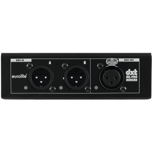 Der EUROLITE DXT-ME PRO DMX-Merger besitzt zwei vollständig unabhängige DMX-Eingänge und einen gemeinsamen DMX-Ausgang. Die Ein- und Ausgänge sind mit hochwertigen 3-poligen XLR-Anschlüssen von Neutrik ausgestattet – ein Standard, der in der professionellen Veranstaltungstechnik weit verbreitet ist. Diese Anschlusslösung gewährleistet eine sichere und stabile Verbindung auch bei häufigem Auf- und Abbau.
