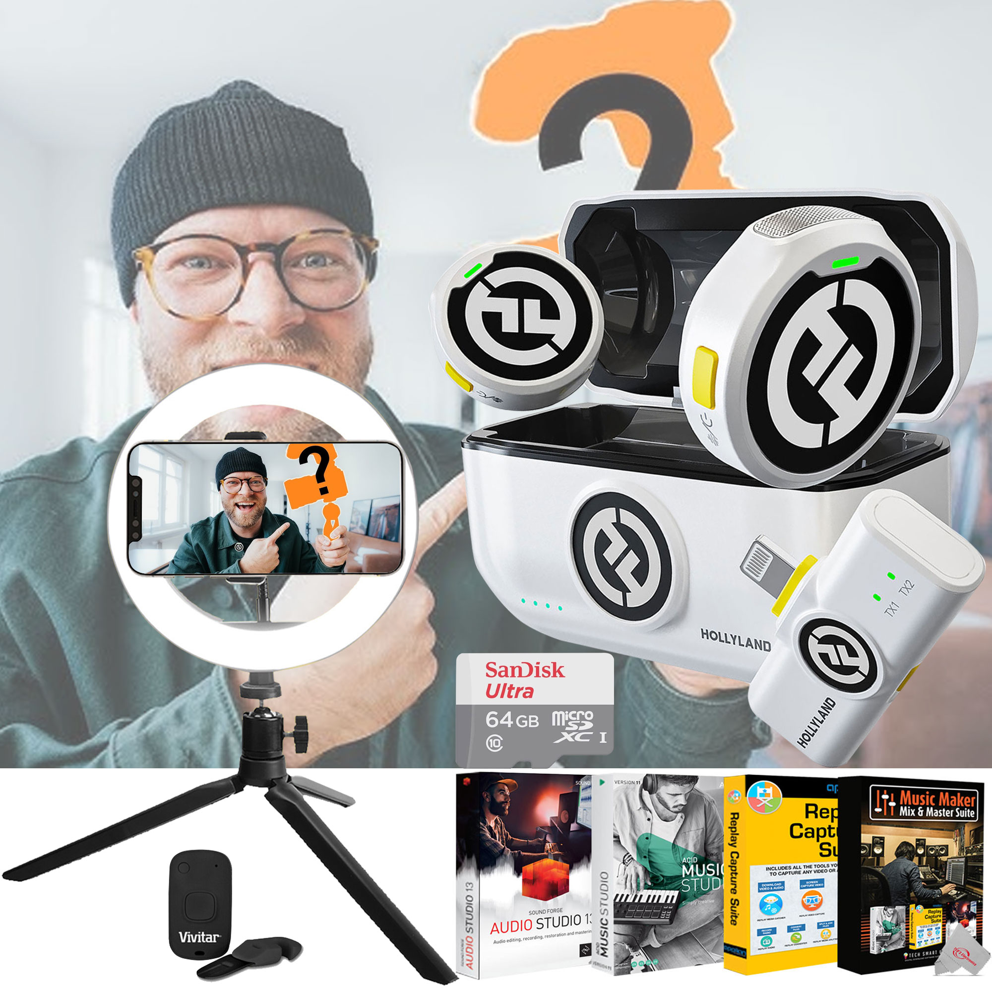 Hollyland LARK M2 DUO 2-Person Wireless Microphone System with Lightning Connector (2.4 GHz, Ivory White) + 2x Vivitar 8 Inch LED Ring Light Dimmable Lamp for Iphone Smartphone with Tripod Mount Stand + SanDisk Ultra 64GB microSDXC Memory Card UHS-1 Upto