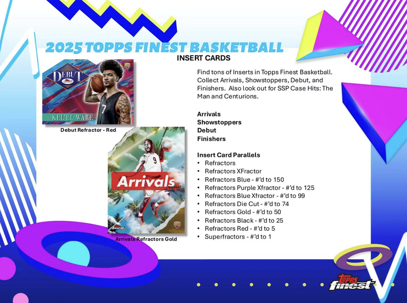 Find tons of Inserts in Topps Finest Basketball. Collect Arrivals, Showstoppers, Debut, and Finishers. Also look out for SSP Case Hits: The Man and Centurions.