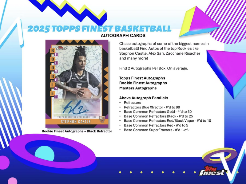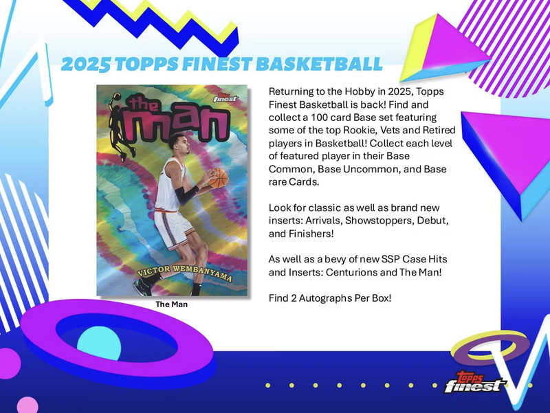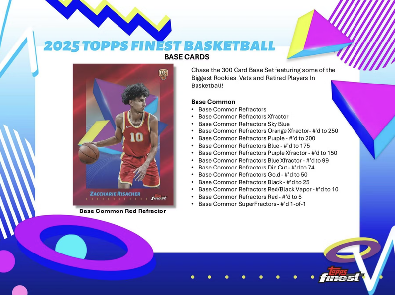 Returning to the Hobby in 2025, Topps Finest Basketball is back! Find and collect a 100 card Base set featuring some of the top Rookie, Vets and Retired players in Basketball! Collect each level of featured player in their Base Common, Base Uncommon, and Base rare Cards.