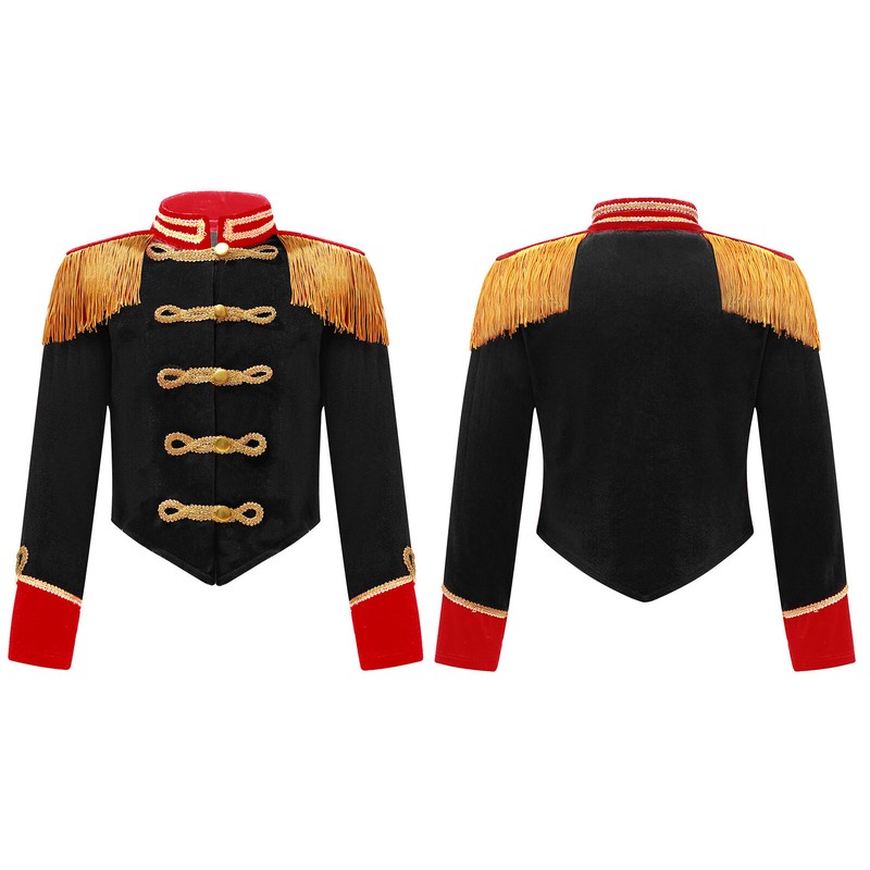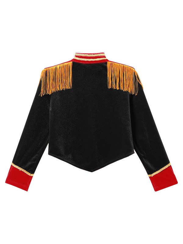 A circus costume jacket for girls, stand collar, long sleeve and front button closure.