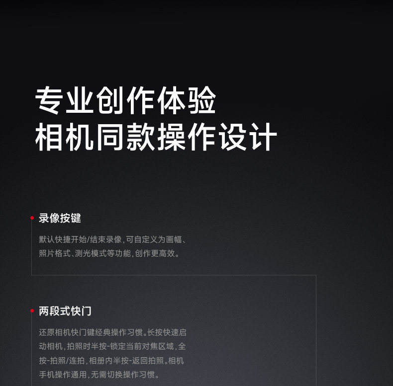Two-stage shutter: When the camera is off, press and hold the shutter for quick activation. When the camera is on, half-press the shutter to focus the lens; press it to take a photo/continuous shooting (adjustable in settings). In the gallery, half-press the shutter to return to the camera interface.