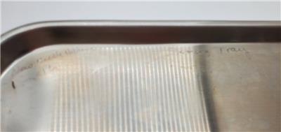 Came from Eastern State Hospital in Williamsburg Virginia. Tray was sterilized and cleaned before it was taken out of service. It does has a little writing on the top of the tray ( pictured). But that can be removed with a solvent I suppose. Measure 15x10" edge to edge.