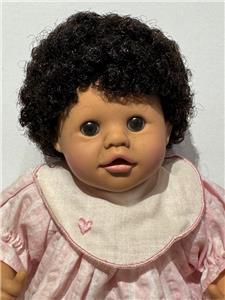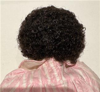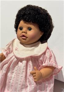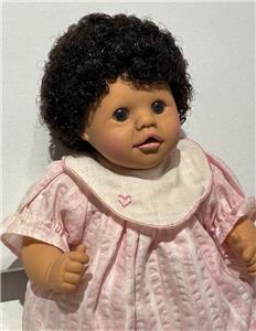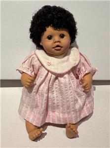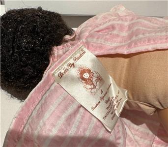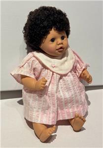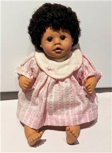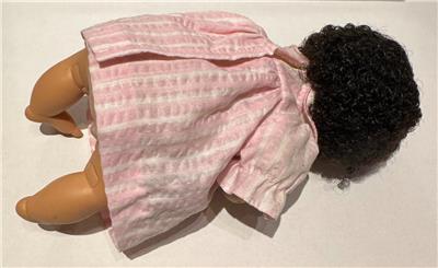 Adorable vintage African American Baby doll with black curly hair, dark eyes and a pink/white striped removable dress. Head is marked PBJ on the back of her neck. Her body is cloth with vinyl head and limbs, She is soft and cuddly.
