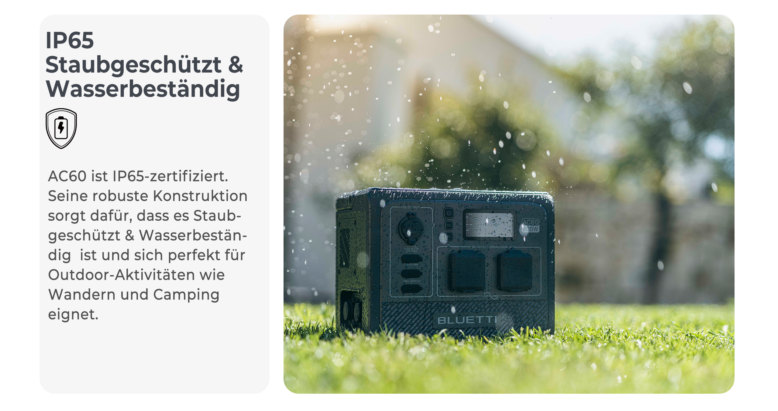 Die AC60 ist die weltweit erste tragbare, wasser- und staubgeschützte Stromversorgungseinheit mit IP65-Zertifizierung. Mit ihren kompakten Abmessungen von 20,06 Pfund ist sie leicht zu transportieren und kann überall und jederzeit Strom liefern. Ob in der staubigen Wüste oder am Seeufer, ob bei Sonnenschein oder Regen - Sie haben die Gewissheit.