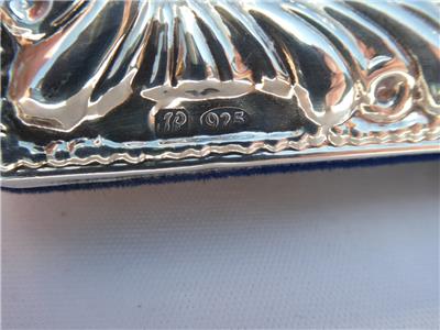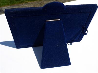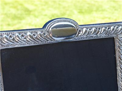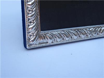 Small beaded edge on the exterior and interior of frame with embossed fluting between the beading. Hallmarked JR 925 in the lower left corner with a Blue velvet Easel back. Beautiful condition. Examine all the photos.