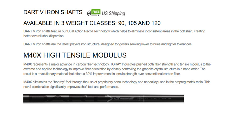 DART V iron shafts feature our Dual Action Recoil Technology which helps to eliminate inconsistent areas in the golf shaft, creating better overall shot dispersion.