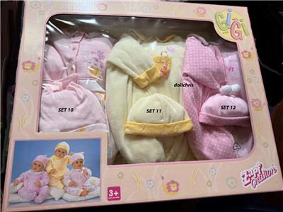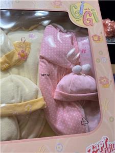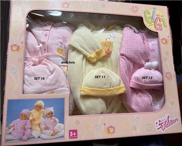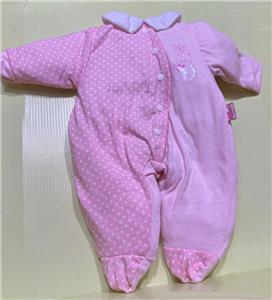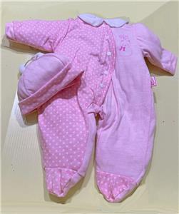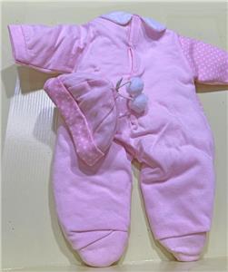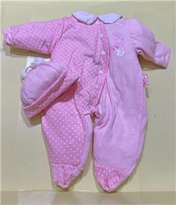 Pink/white dotted footed sleeper with collar and GiGi emblem. Matching pink hat with 2 pom-poms. Zapf Creation sewn-in tag. Sleeper has back Velcro closure and mock front closure with decorative snaps.