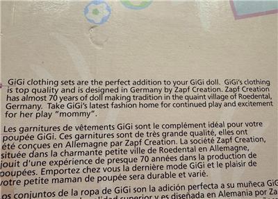 Part of a special 3 outfit GiGi doll clothing set issued years ago. This came in a huge box that would be too expensive to ship, therefore I decided to remove and sell each outfit separately. All items are new and just removed from package.