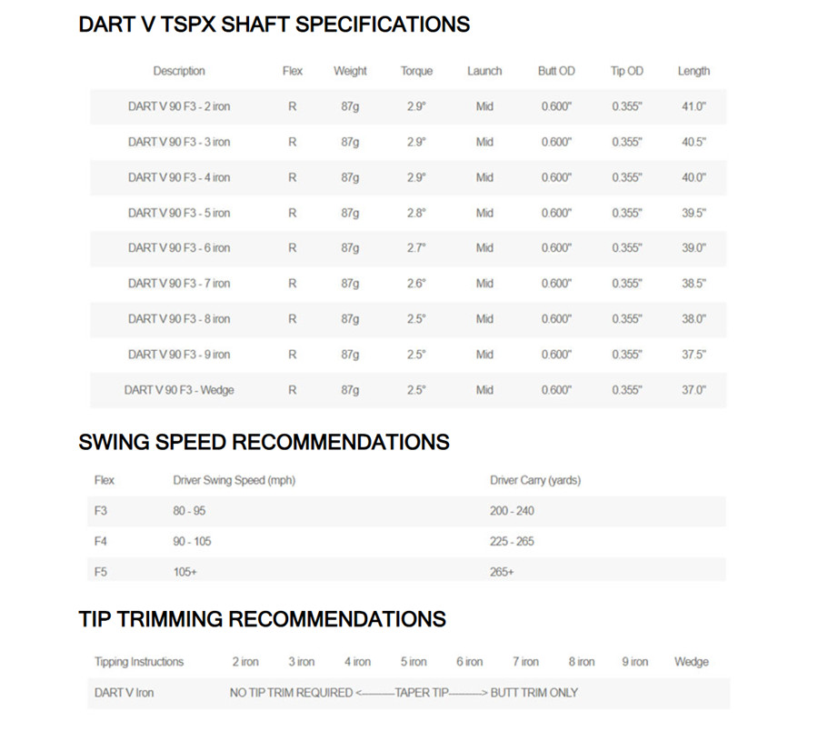 DART V IRON SHAFTS ARE AVAILABLE IN 3 WEIGHT CLASSES: 90, 105 AND 120