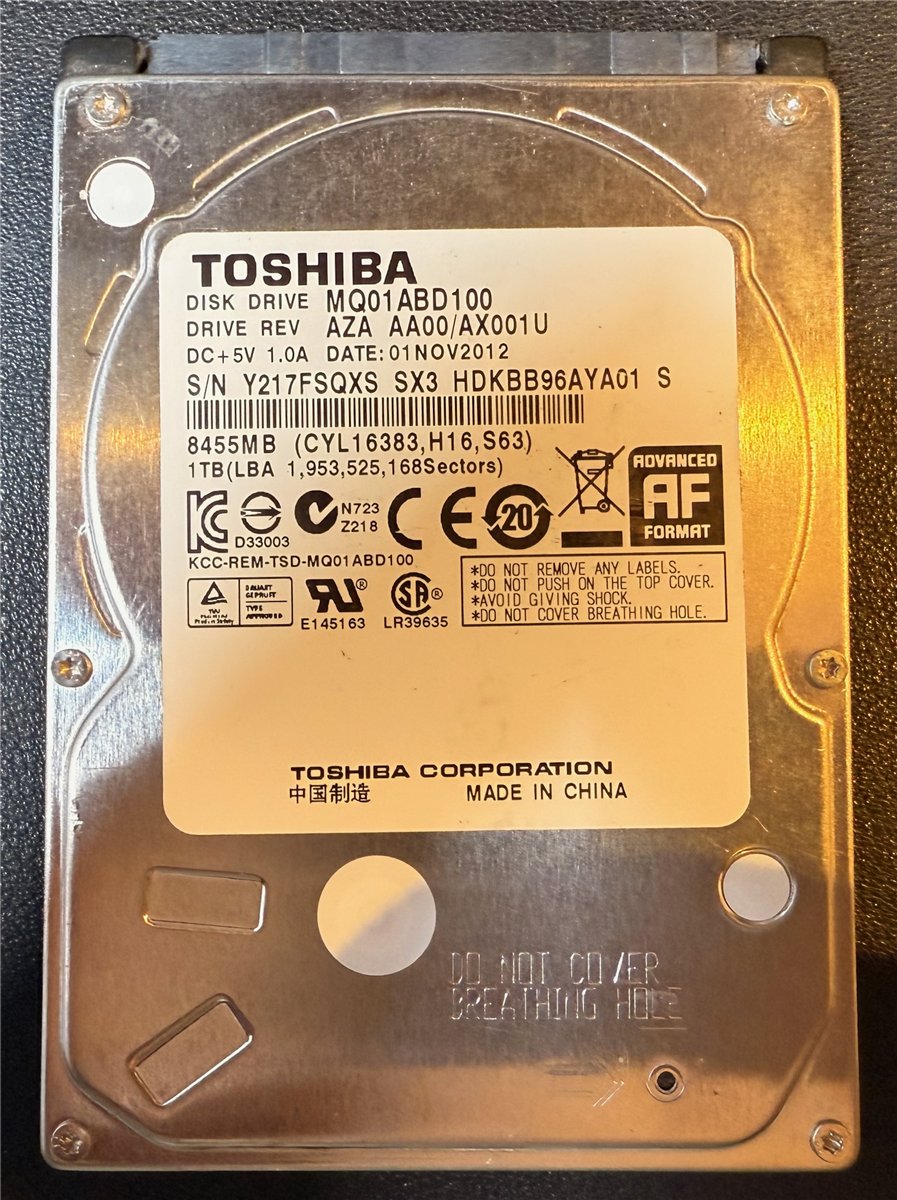 | Bezeichnung / Designation: | Toshiba, 1TB, MQ01ABD100, AZA AA00/AX001U, S/N: Y217FSQXS, SATA HDD | | Verwendung / Use: | Festplatte, intern | | Zeítraum (Datum) / Period (Date) | ca. nach 2018 | | Zustand / Status: | Der Artikel war bei uns in Betrieb. Das Gerät hat bis zum Schuß problemlos funktioniert ! |
