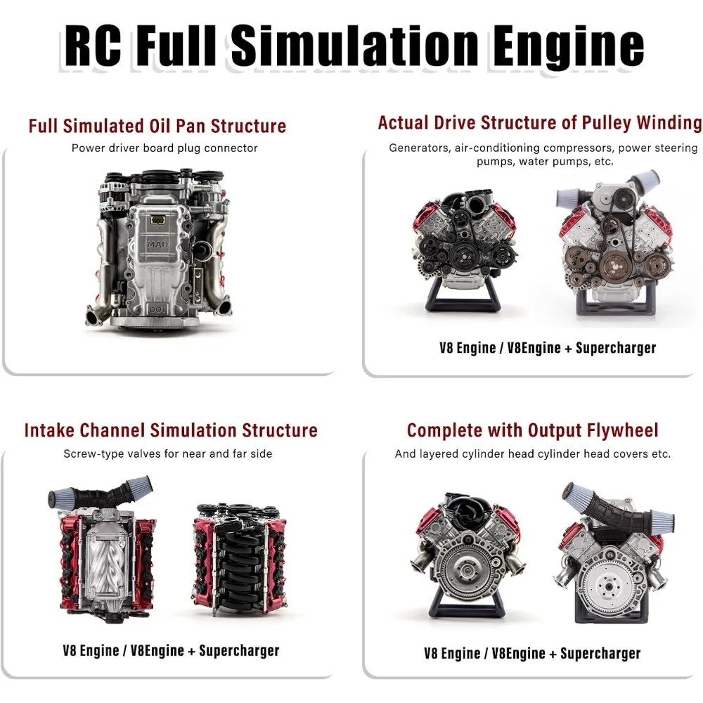 Compatibility: Simulation V8 engine model is suitable for a wide range of RC models such as AX90104, SCX10, Capra, VS4-10 Pro/Ultra. installing this engine will make your RC car more complete and more simulated. The running engine adds a dynamic element to your RC experience!