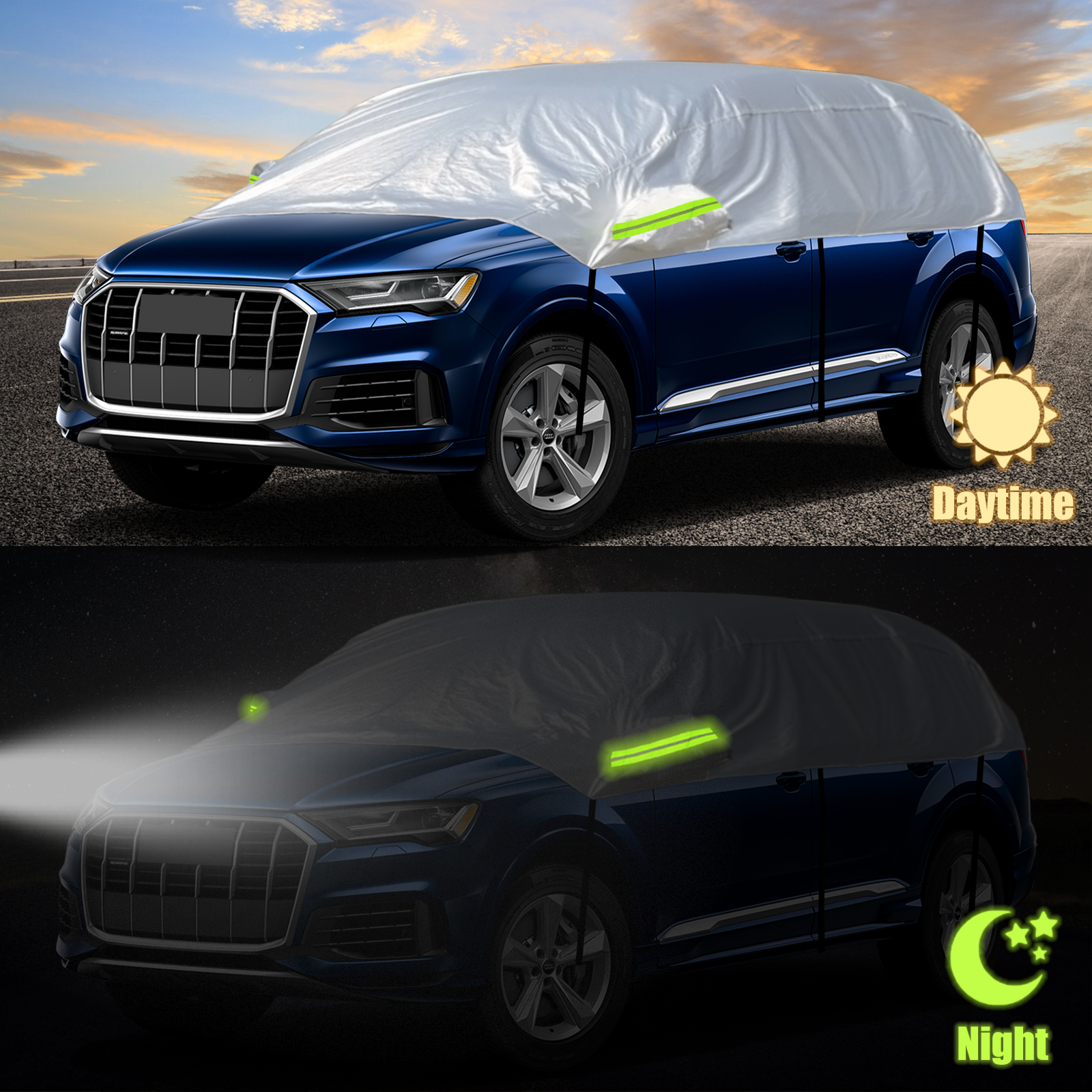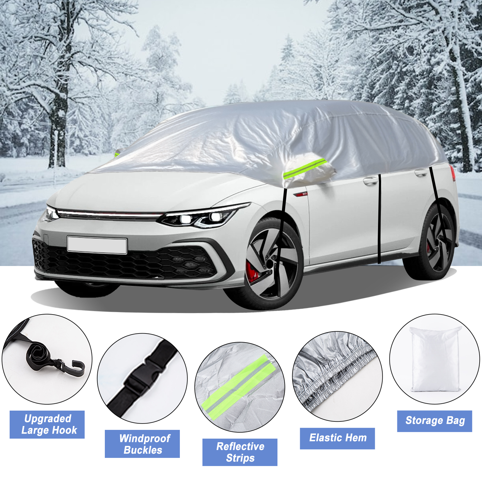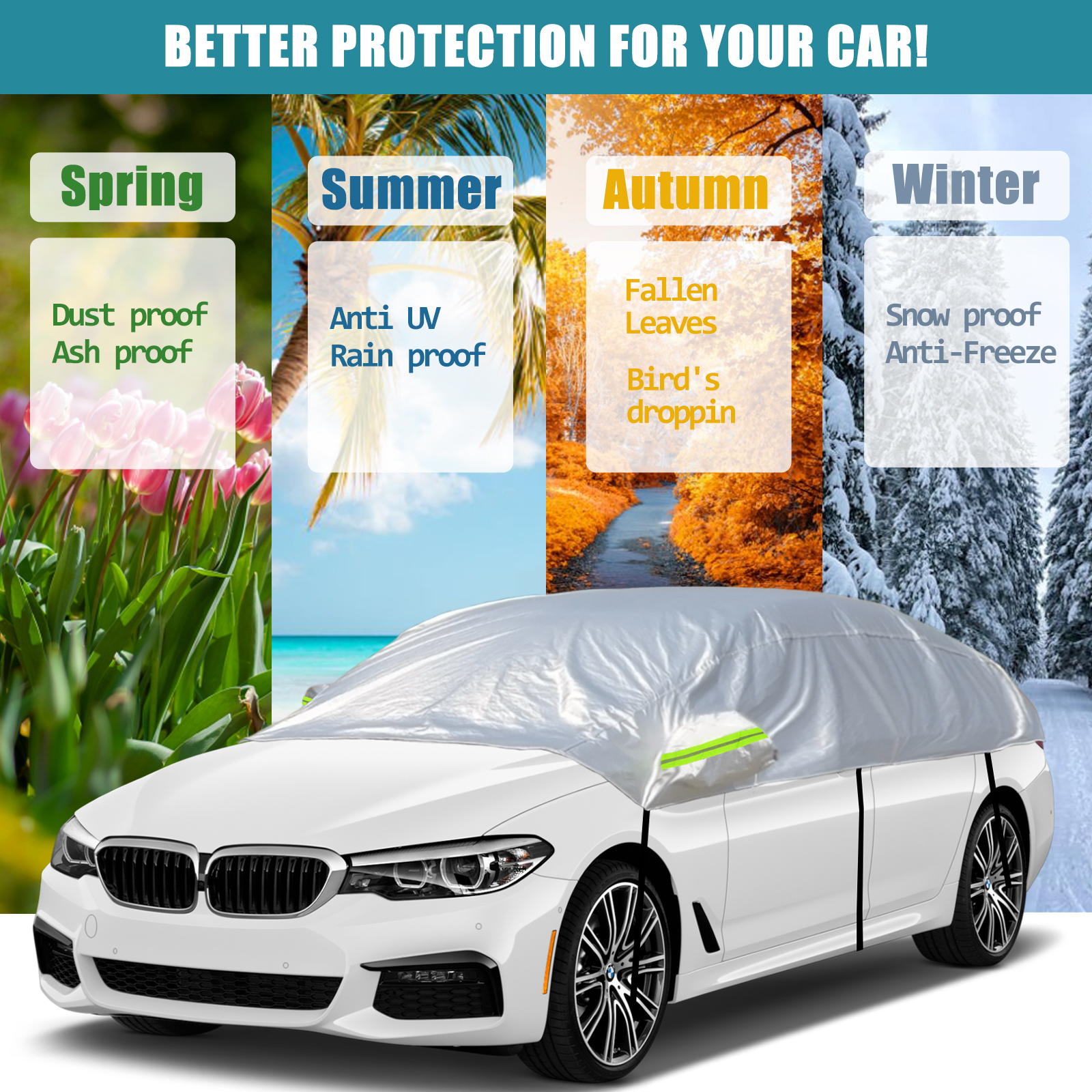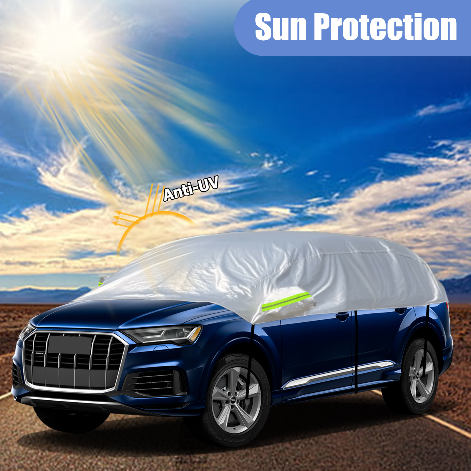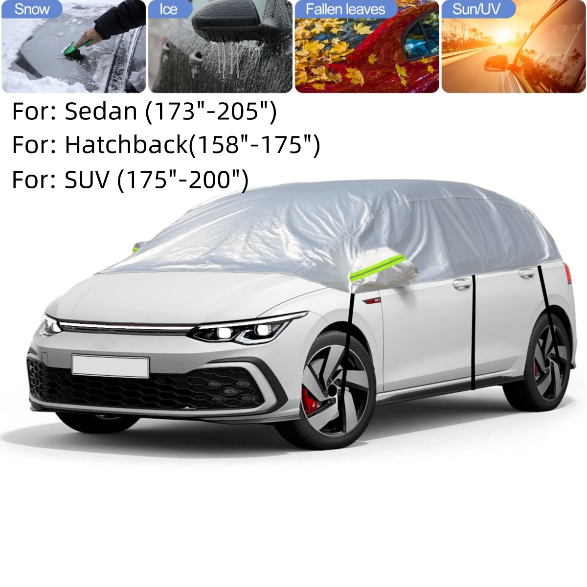 Autoschutz: Schützt Ihr Fahrzeug gut vor Schnee, Frost, Sonne, Staub, Schmutz usw. Hergestellt aus hochwertigem Stoff, reflektiert die Aluminium-Oberflächenbeschichtung im Sommer effektiv UV-Strahlen. Entfernen Sie im Winter ganz einfach den Schnee von der Windschutzscheibe Ihres Autos, indem Sie einfach die halbgarage entfernen.
