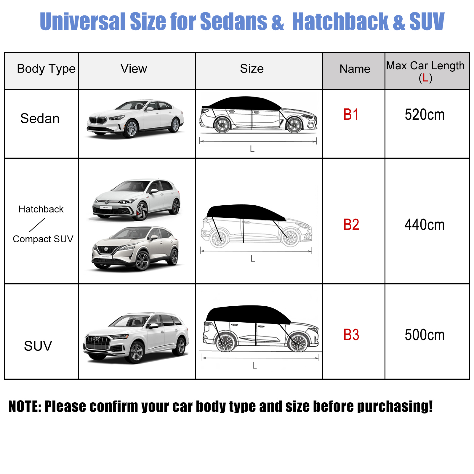 B3: Universalgröße für SUV Modelle, einer Länge von bis zu 500 cm.