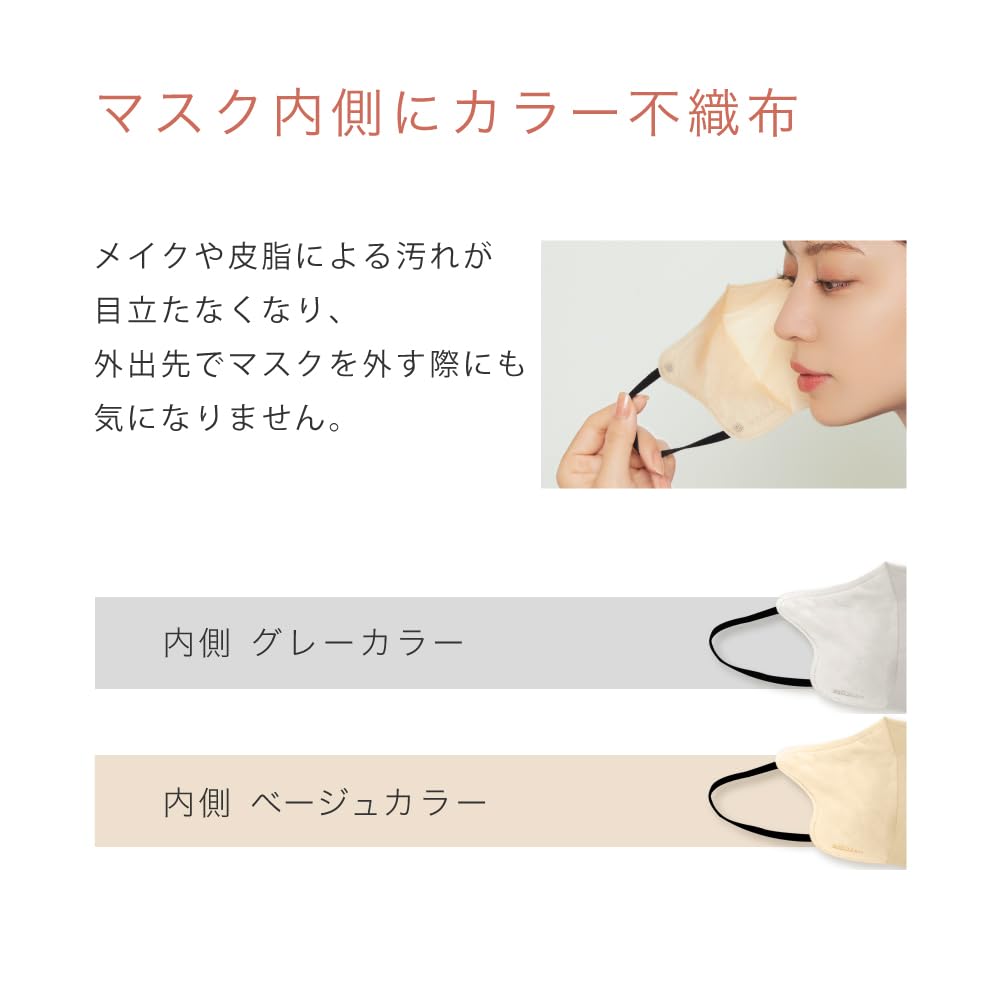 Dirt on the inside of the mask is a concern for the majority of mask wearers. By lining the mask with colored nonwoven fabric, makeup and sebum stains are less noticeable, making it easier to remove the mask when you're out and about.