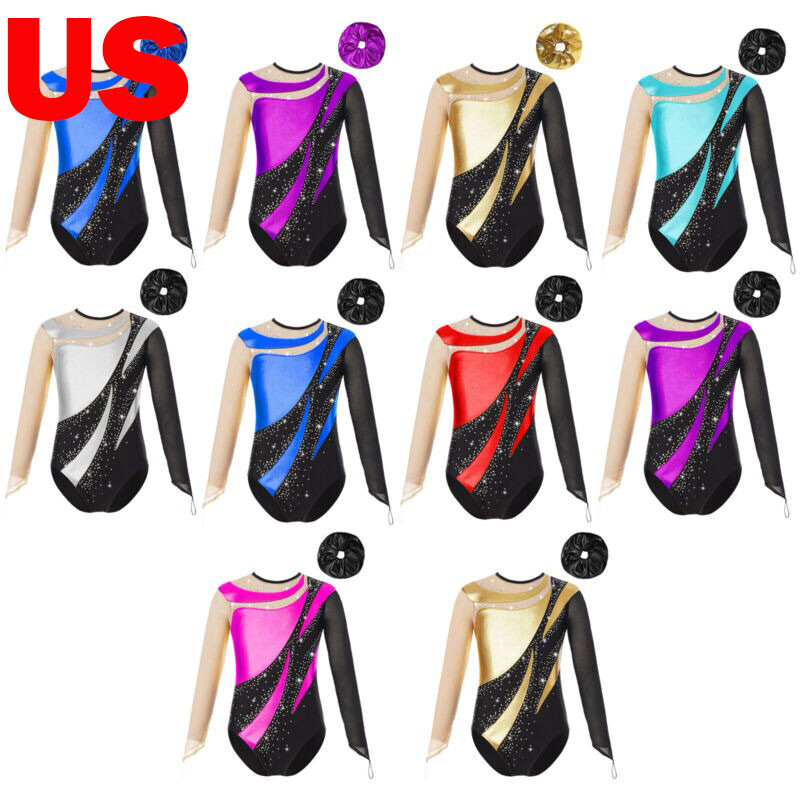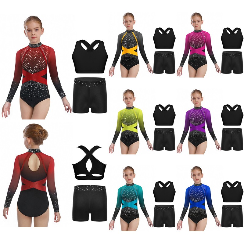UK Kids Girls Glittery Rhinestones Ballet Gymnastics Dance Leotard + Shorts Sets
