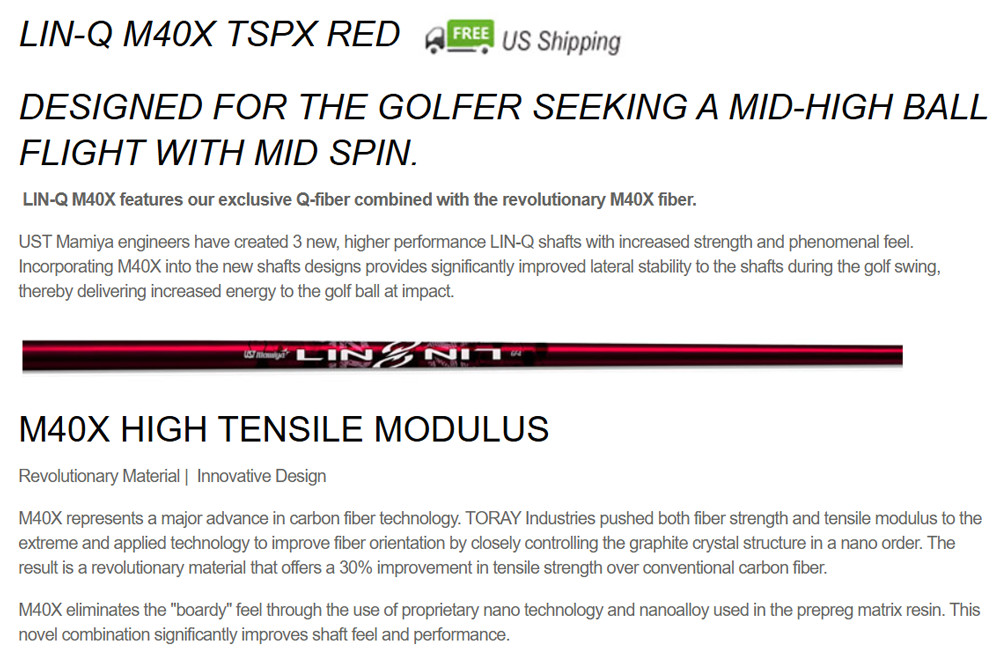 UST Mamiya engineers have created 3 new, higher performance LIN-Q shafts with increased strength and phenomenal feel. Incorporating M40X into the new shafts designs provides significantly improved lateral stability to the shafts during the golf swing, thereby delivering increased energy to the golf ball at impact.