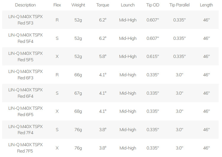 | LIN-Q M40X TSPX Red 5F3 | R | 52g | 6.2° | Mid-high | 0.335" | 3.0" | 46" |