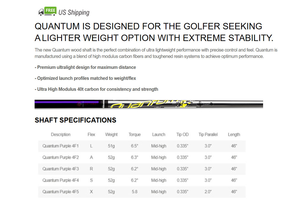 | Quantum Purple 4F4 | S | 52g | 6.2° | Mid-high | 0.335" | 3.0" | 46" |
