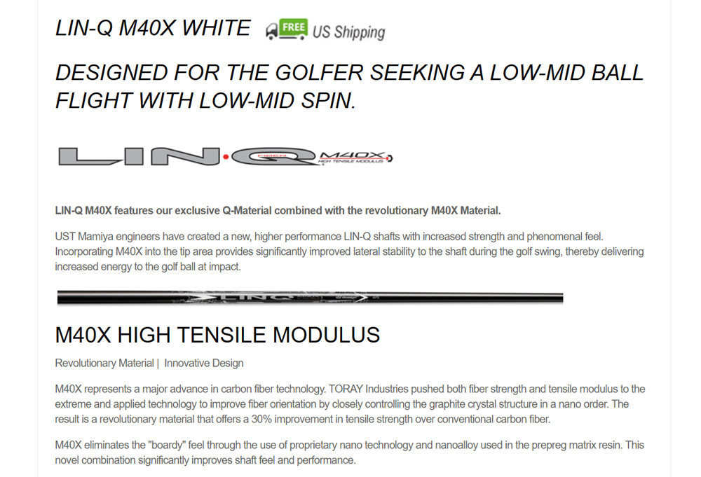 UST Mamiya engineers have created a new, higher performance LIN-Q shafts with increased strength and phenomenal feel. Incorporating M40X into the tip area provides significantly improved lateral stability to the shaft during the golf swing, thereby delivering increased energy to the golf ball at impact.