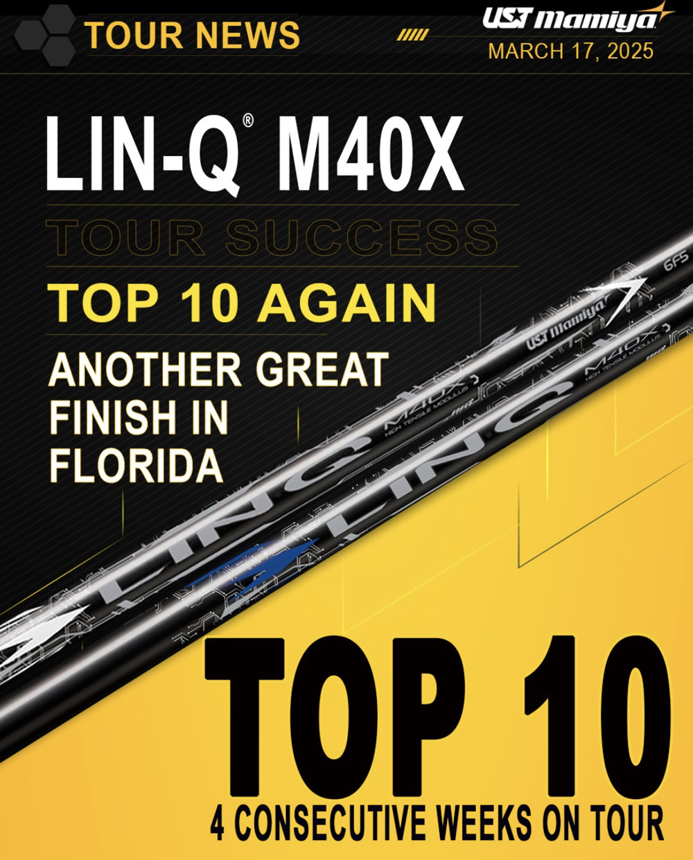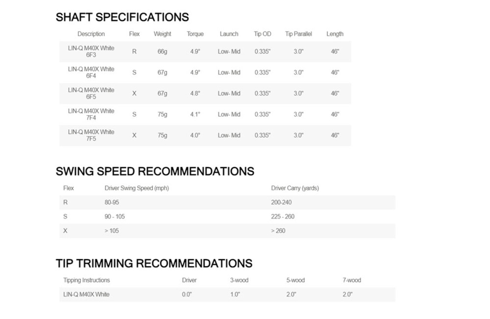 UST Mamiya engineers have created a new, higher performance LIN-Q shafts with increased strength and phenomenal feel. Incorporating M40X into the tip area provides significantly improved lateral stability to the shaft during the golf swing, thereby delivering increased energy to the golf ball at impact.