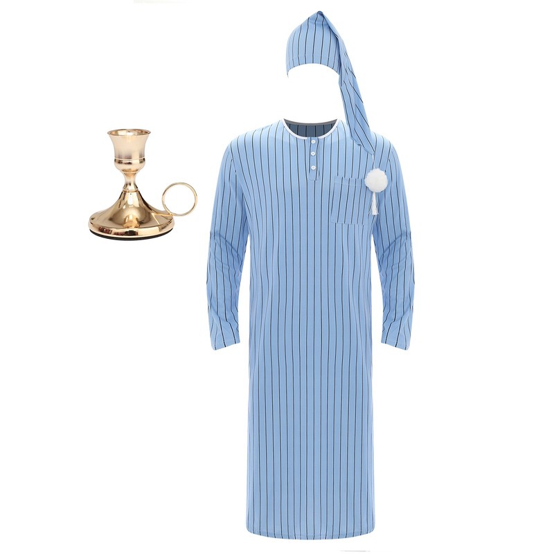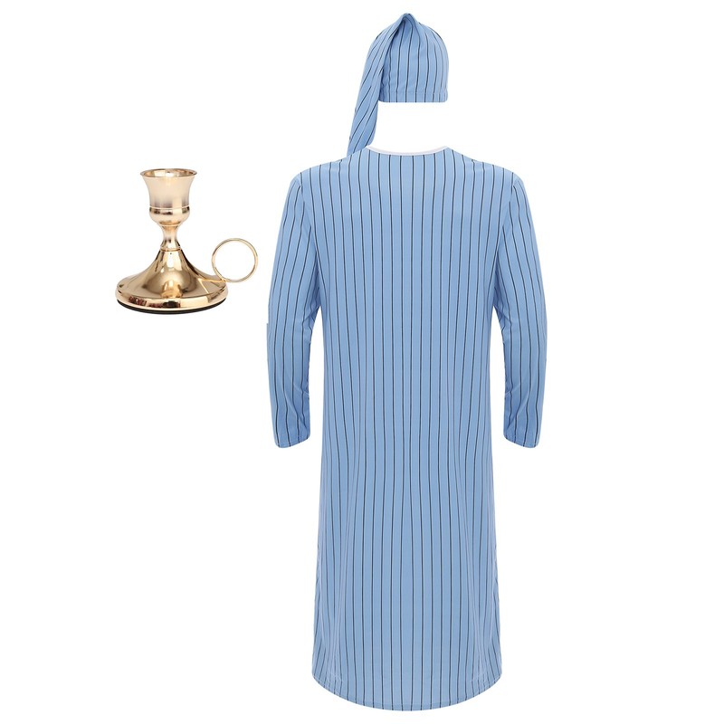 Set Include: 1Pc Sleep Dress, 1Pc Hat, 1Pc Candle HolderCondition: New with tagsMaterial: Dress and Hat: 90% Polyester, 10% Spandex; Candle Holder: 100% MetalFeatures:Made from a blend of polyester and spandex, the sleep dress offers flexibility and comfort, allowing for unrestricted movement during sleep or relaxation.The striped design of the sleep dress and hat is both classic and trendy, adding a touch of style to the Christmas-themed set.The long-sleeve and loose fit of the pajama robe provide warmth and a cozy feeling, perfect for the winter holiday season.The pointed hat and metal taper candlestick are unique accessories that enhance the Christmas party atmosphere and make the set more festive.This set is ideal for Christmas parties, as well as for relaxing at home during the holiday, creating a fun and joyful holiday experience. Candle Holder Size: Bottom Dia x Top inner dia x H: 6.8 x 2.3 x 8cm/ 2.67 x 0.9 x 3.1 inch