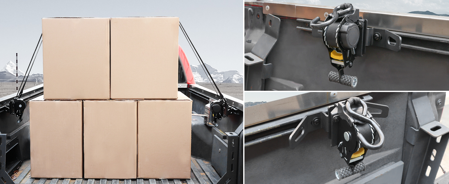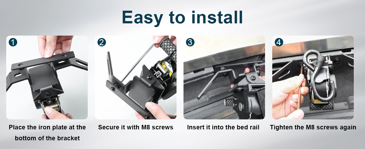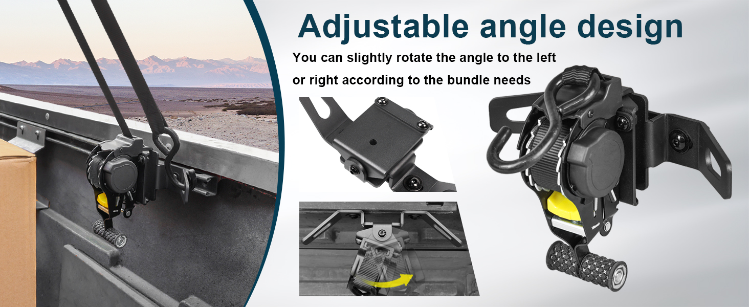 Features • Multi-Functional Fastening Design for Dynamic Transportation Needs: Leveraging the torque amplification effect of the ratchet mechanism, a small-angle swing of the handle enables significant tightening of the strap body. A single 110-inch long and 1-inch wide polyester fiber strap can withstand a 1500-pound working load, easily securing heavy wooden crates and small equipment. In the face of transportation jolts and dynamic braking stresses, the strap body undergoes slight deformation to cushion impacts, maintaining secure fastening without damaging the cargo or the strap itself. When unlocking, simply flip the paddle to quickly release the tension—this saves time compared to traditional ropes. It can also be used for temporarily securing car doors or hoods during maintenance, or reinforcing roof rack equipment during off-roading, covering multiple usage scenarios. • Enhanced Ease of Use: After the pawl engages with the ratchet tooth groove, it locks automatically and stably, remaining tight even during severe jolts, mountain road transportation, and long-distance cross-border freight—offering far greater safety than traditional ropes. The strap is suitable for bundling small cartons, pipes, and plates, flexibly adapting to cargo of different sizes. It is lightweight, making it easy for drivers and outdoor enthusiasts to carry and store without adding extra weight. • Simple and Easy Installation: This product has undergone rigorous vehicle compatibility testing to ensure a simple and efficient installation process. It can be firmly fixed using the provided screws, requiring no additional drilling or cutting, thus achieving a simple and damage-free installation.