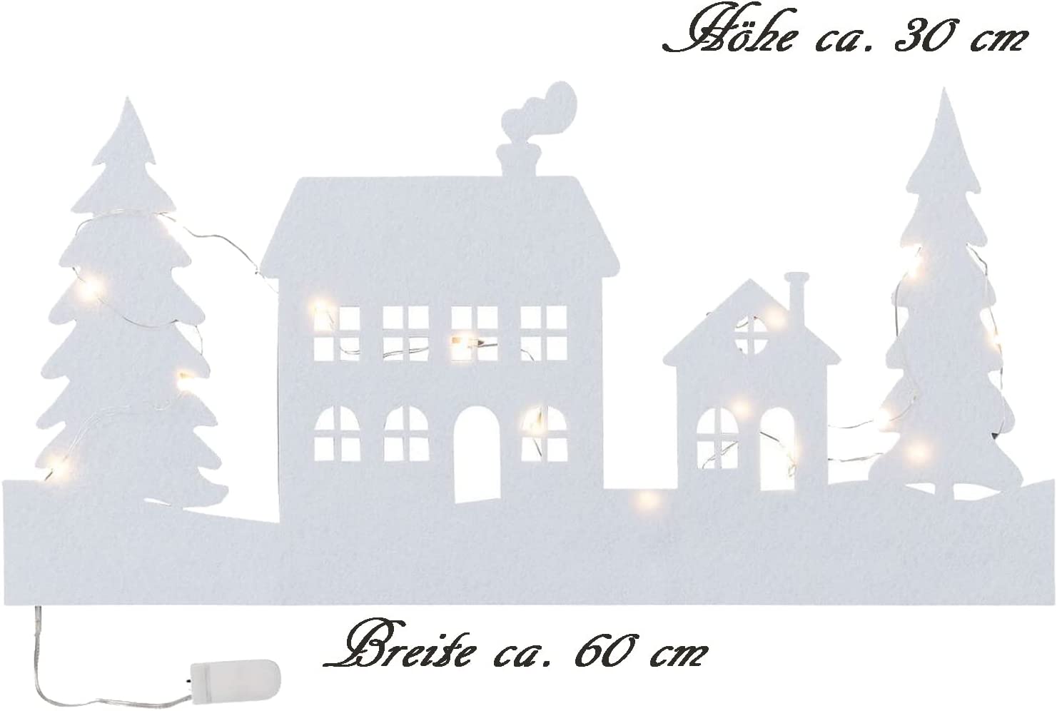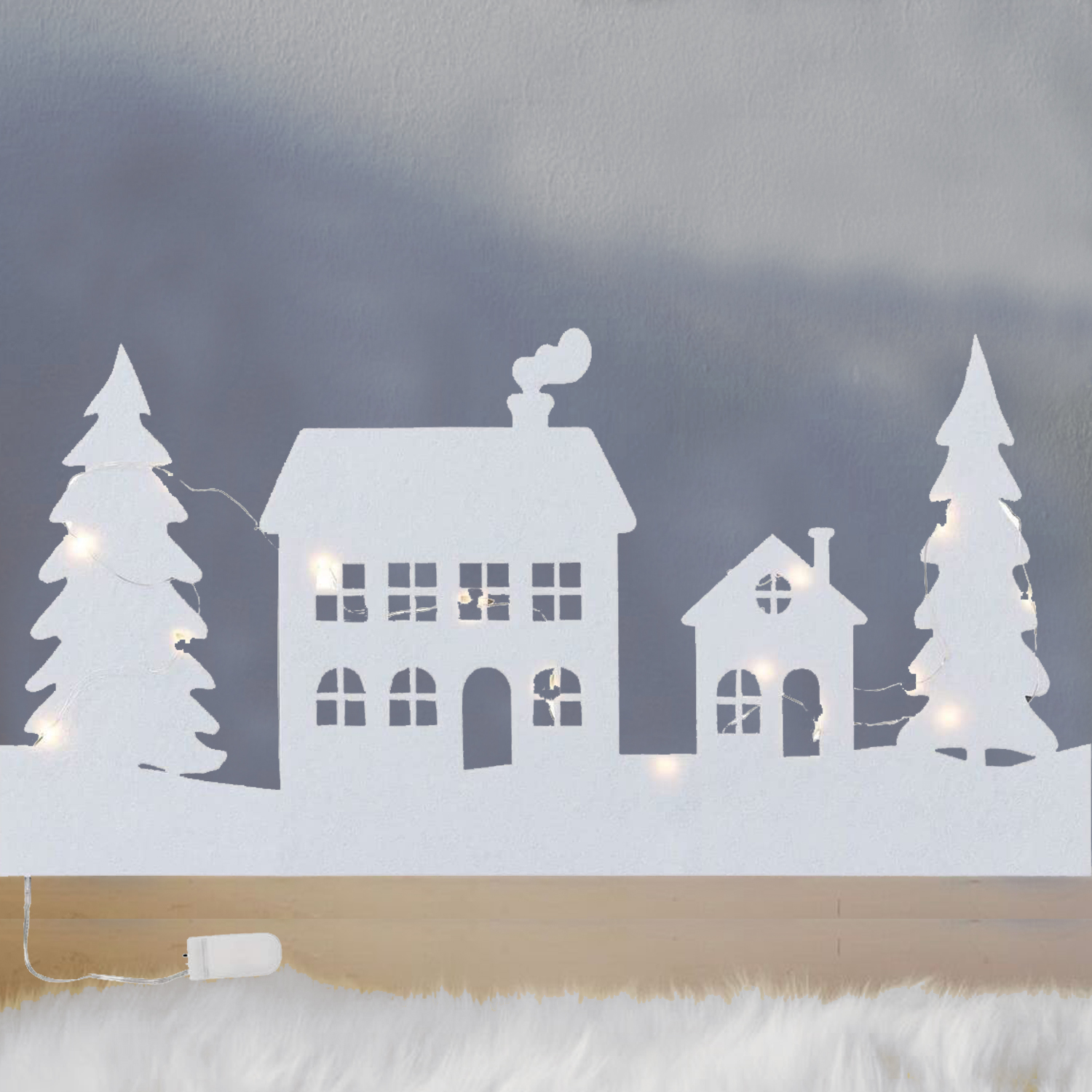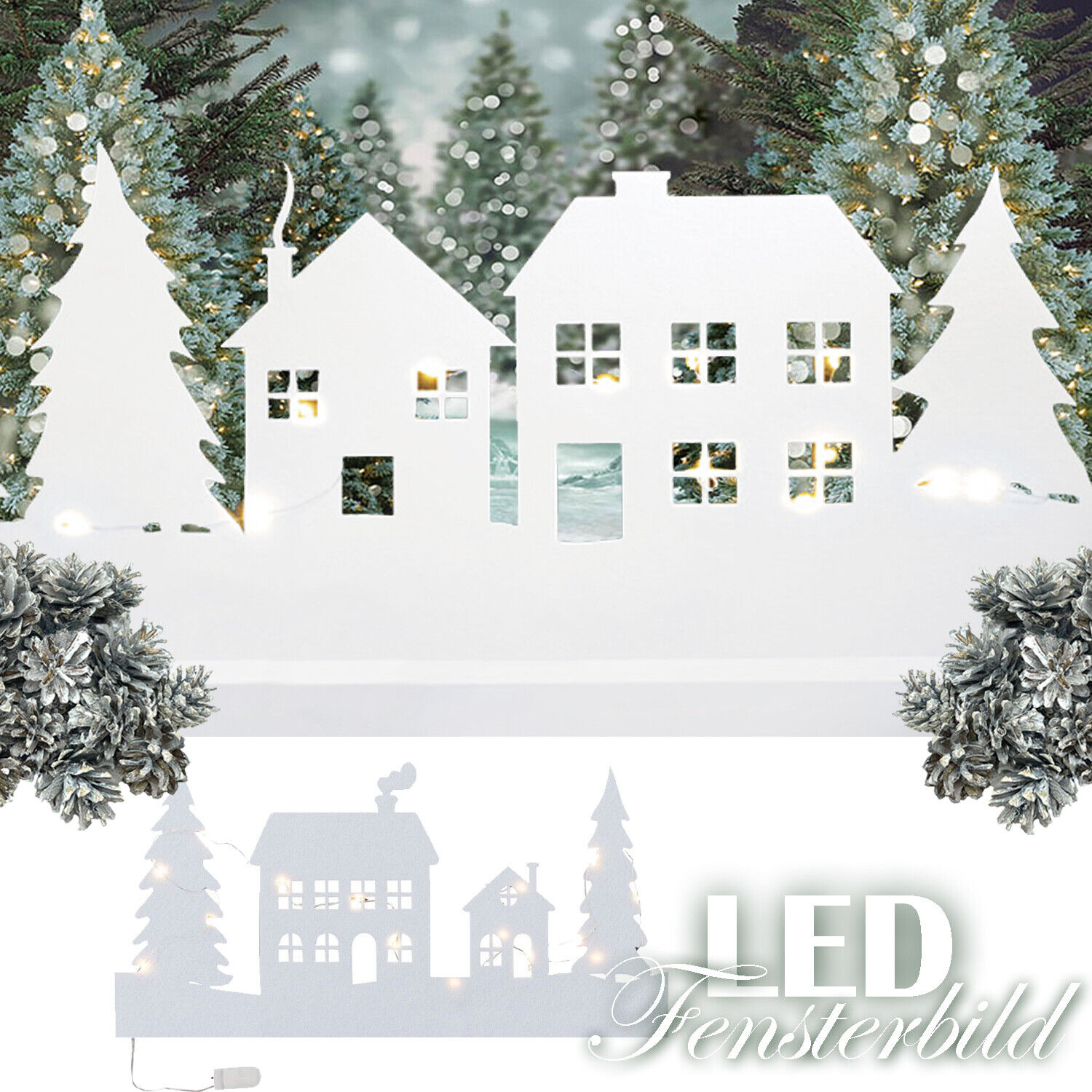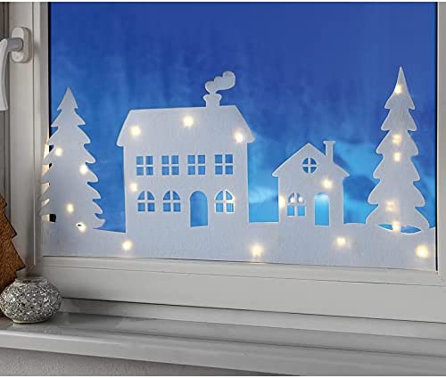 Wunderschönes Fensterbild mit den Maßen (H) 30 x (B) 60cm wird mit 15 warmweißen (2200K) Micro LEDs auf silbernem Draht zur stilvollen Dekoration, die gemütliches Winterfeeling aufkommen lässt.