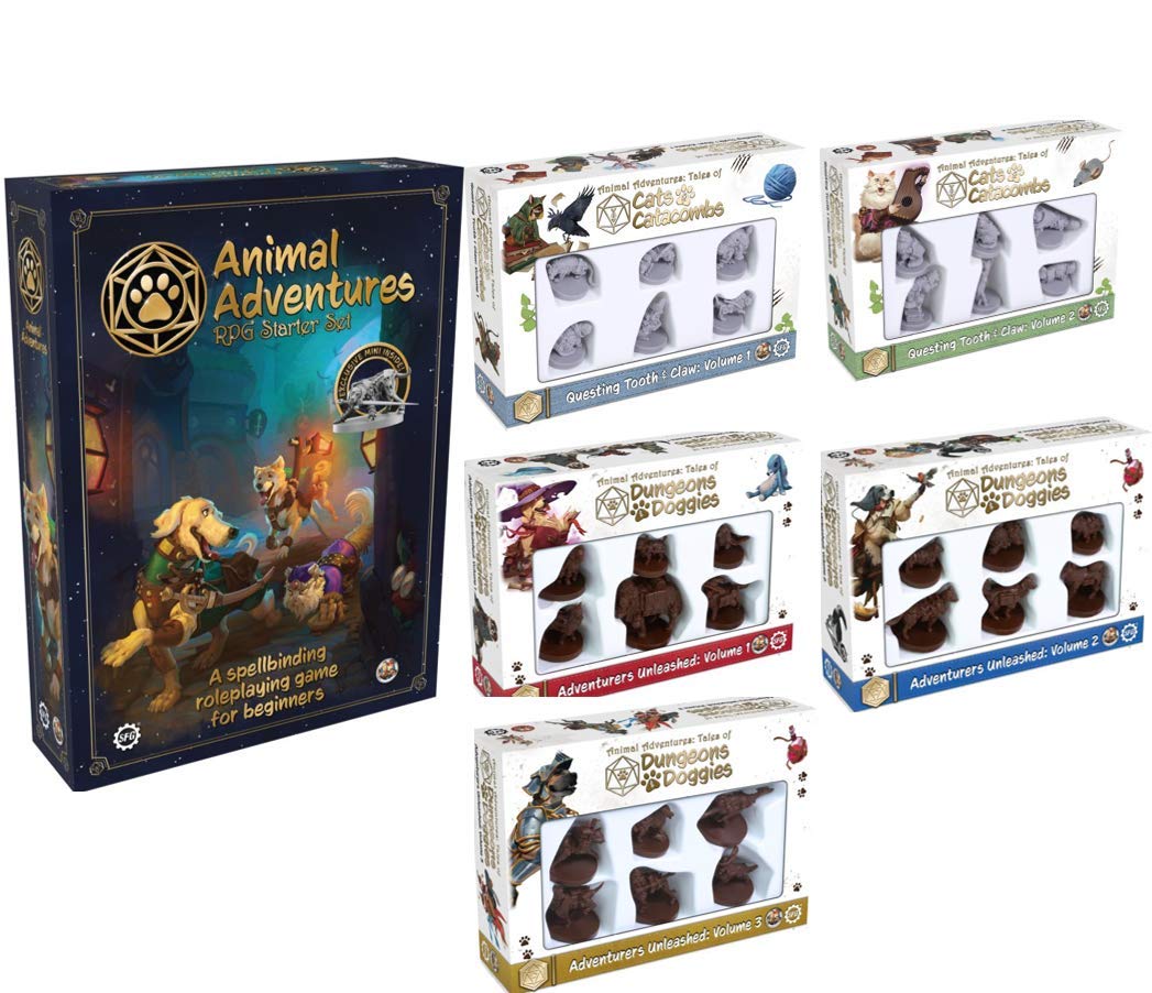 - Package Includes: Steamforged Animal Adventures RPG Starter Set (Black), Animal Adventures Tales of Cats and Underground Tombs, Animal Adventures Tales of Cats and Grounds Volume 2, Animal Adventure Dungeons and Doggies 3, Animal Dungeons and Doggies Volume 2, Animal Dungeons and Doggies Volume 1